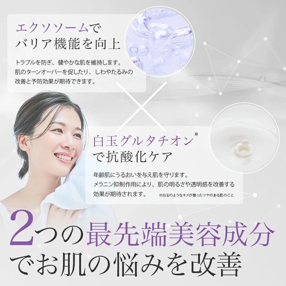 肌が目覚める贅沢フェイスマスク。 エクソソームでバリア機能向上。 白玉グルタチオンで抗酸化ケア。 2つの最先端美容成分でお肌の悩みを改善。