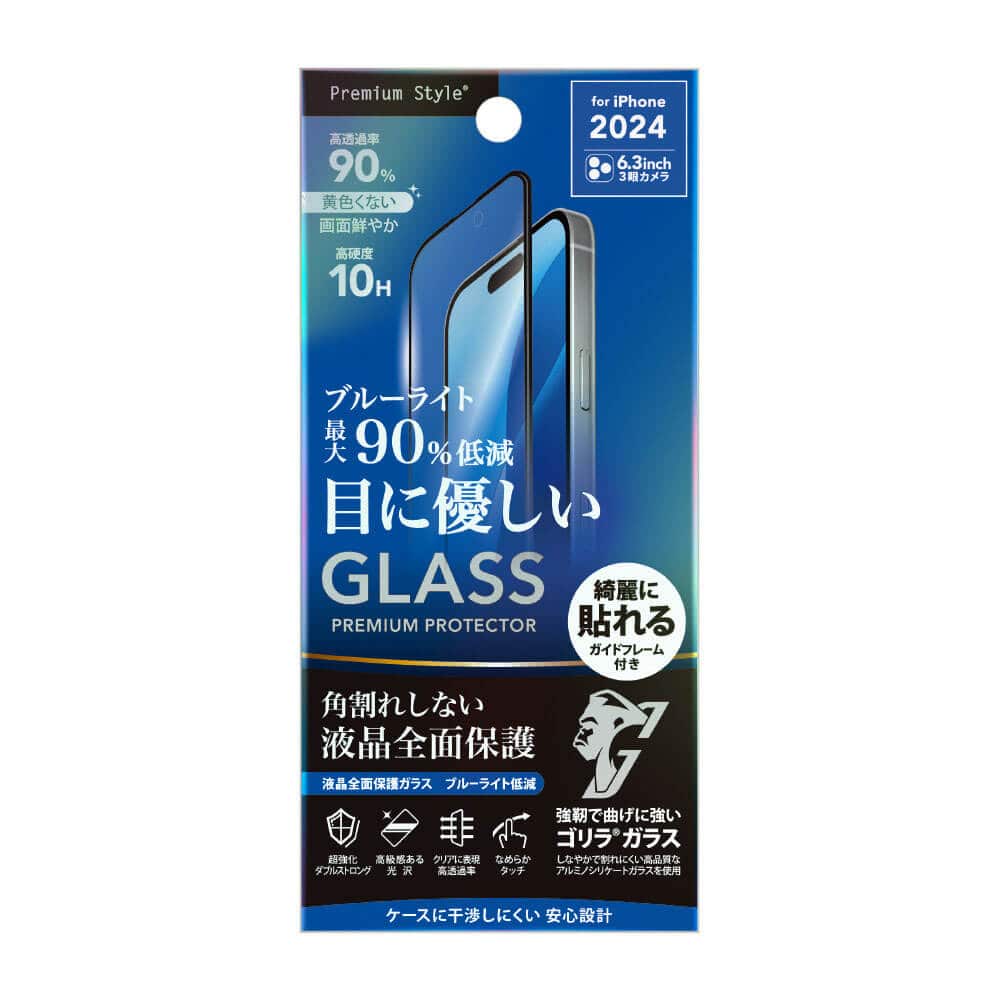 極薄でも強靭なゴリラガラスを採用し、通常ガラスの表面加工に加えて分子レベルでガラスの密度を高めたダブルストロング製法のiPhone 16 Pro用 液晶全面保護ガラス ブルーライトカット/高透明です。 ガラスの密度を高める事により耐衝撃性能を実現。 角割れを防ぐ為、液晶画面の端まで覆う立体加工のPETフレームを使用したハイブリッド設計。 最大約90%のブルーライト低減率で目の疲れを軽減します。 美しい映像や画像をよりクリアにお楽しみ頂ける高光沢タイプ。 また、従来の液晶保護ガラスにある飛散防止加工、撥水・撥油加工、気泡軽減機能など快適性も考慮しました。 保護ケースに干渉しにくい安心設計。 ガラスの貼り付けに便利なガイドフレーム・ほこり取りシール・クリーニングクロスの「貼り付けキット」が付属しています。 適合機種 iPhone 16 Pro 商品サイズ W69×H147×D0.25mm 13g パッケージサイズ W90×H190×D15mm 60g