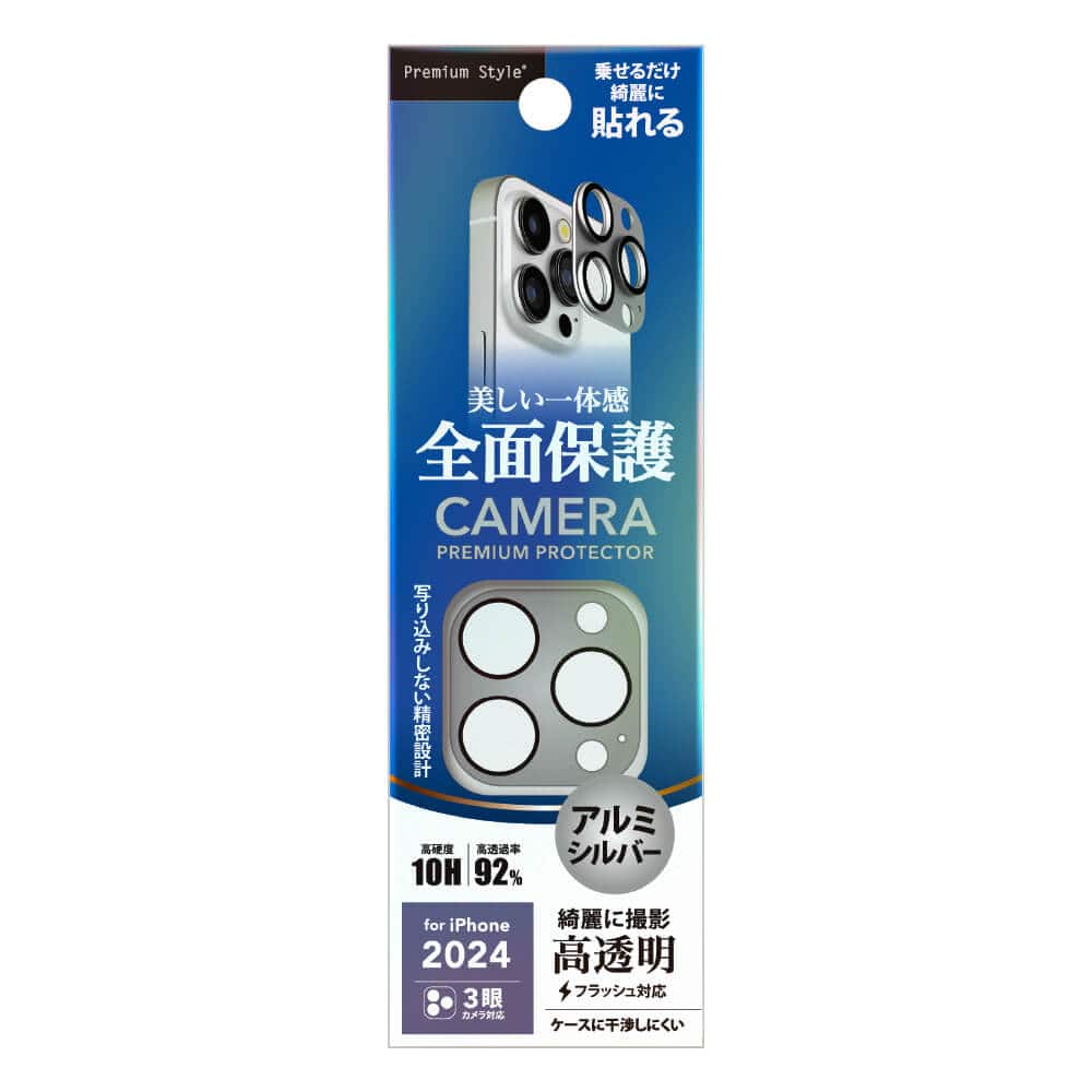 スタイリッシュなアルミタイプのiPhone 16 Pro / 16 Pro Max 3眼カメラ用 カメラフルプロテクターです。 光線透過率92%の表面硬度10H光沢ガラスと高級感のあるアルミフレームで端末本体のカメラレンズ周りからLEDライト部までキズを付けず、美しくカメラレンズを守ります。 貼り付け時に便利なクリーニングクロス・ほこり取りシール付き。 適合機種 iPhone 16 Pro iPhone 16 Pro Max 商品サイズ W37×H38×D3mm 3g パッケージサイズ W60×H190×D10mm 13g