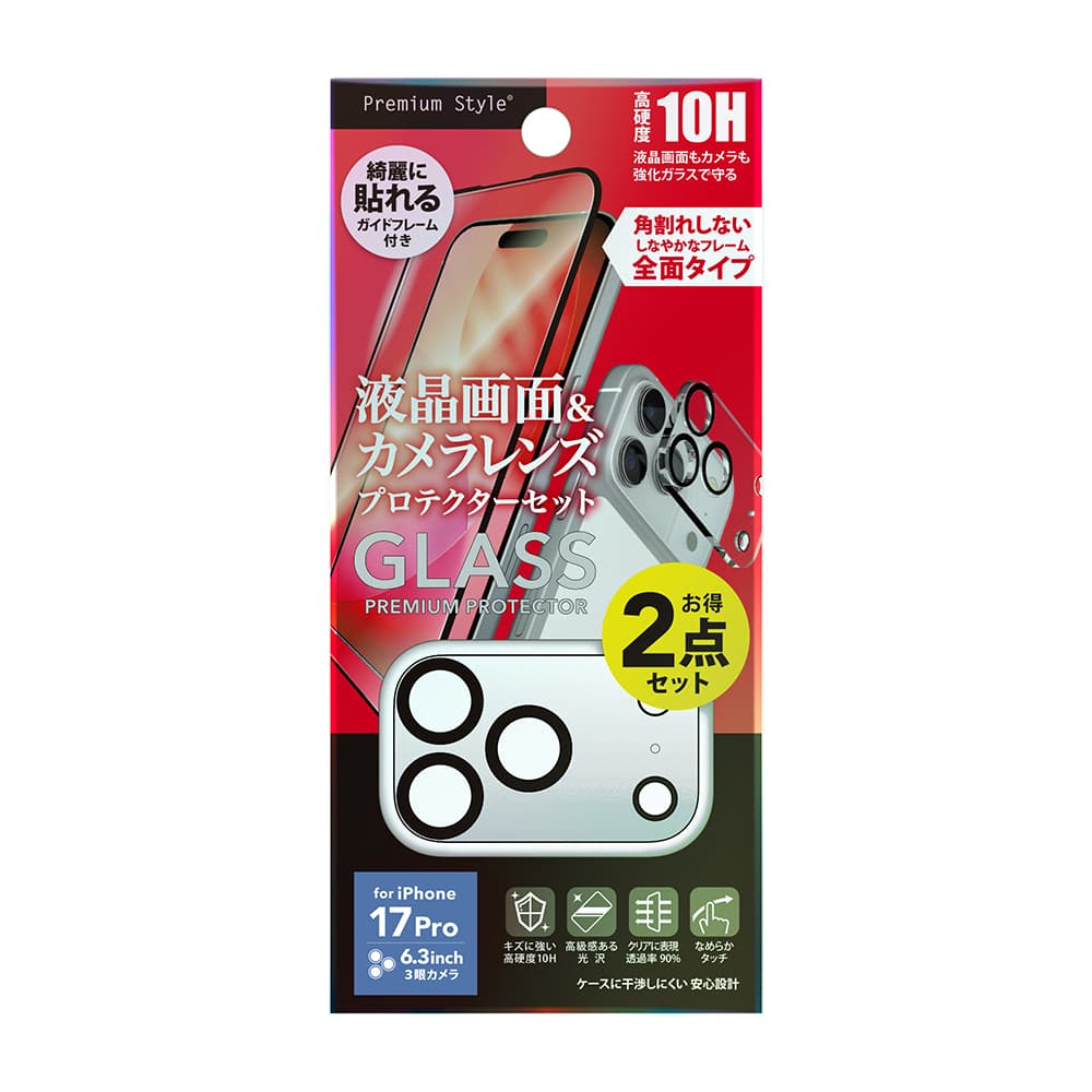 「PG-25BGLFPST」は、大切な液晶画面やカメラレンズをキズから守るiPhone 17 Pro用 液晶全面保護ガラス&カメラプロテクターセット 高透明です。 液晶保護ガラスは、透過率の高い光沢ガラスで写真や動画を綺麗に楽しめます。 表面硬度10Hで液晶画面をキズから守ります。 角割れを防ぐ為、液晶画面の端まで覆う立体加工のPETフレームを使用したハイブリッド設計。 万が一ガラスが割れても飛び散らない飛散防止加工済みです。 優れた操作性と使用感の追求、画面操作を邪魔しない滑らかな指どおりを実現する為、撥水・撥油加工を施しました。 また、貼り付け時に付く細かな気泡も消える素材を採用しております。 保護ケースに干渉しにくい安心設計。 カメラフルプロテクターは透過率・表面硬度が高いガラスと薄くて耐久性に優れたアクリル素材で一体成形されており、端末本体のカメラレンズ周りをしっかり護ります。 貼り付け時に便利なクリーニングクロス・ほこり取りシール付き。 また、プロテクターが剥がしにくい場合に便利な取り外し用リムーバーを付属しています。