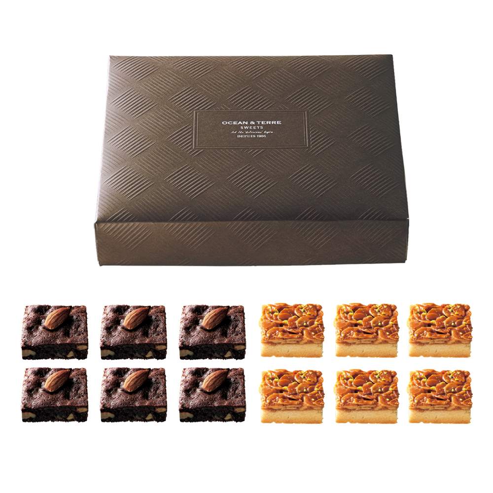 しっとり焼いた、ほろ苦い大人の濃厚ブラウニーと、キャラメリゼしたたっぷりのアーモンドスライスをクッキー生地に重ねた香ばしいフロランタンです。ブラウニー×6、フロランタン×6