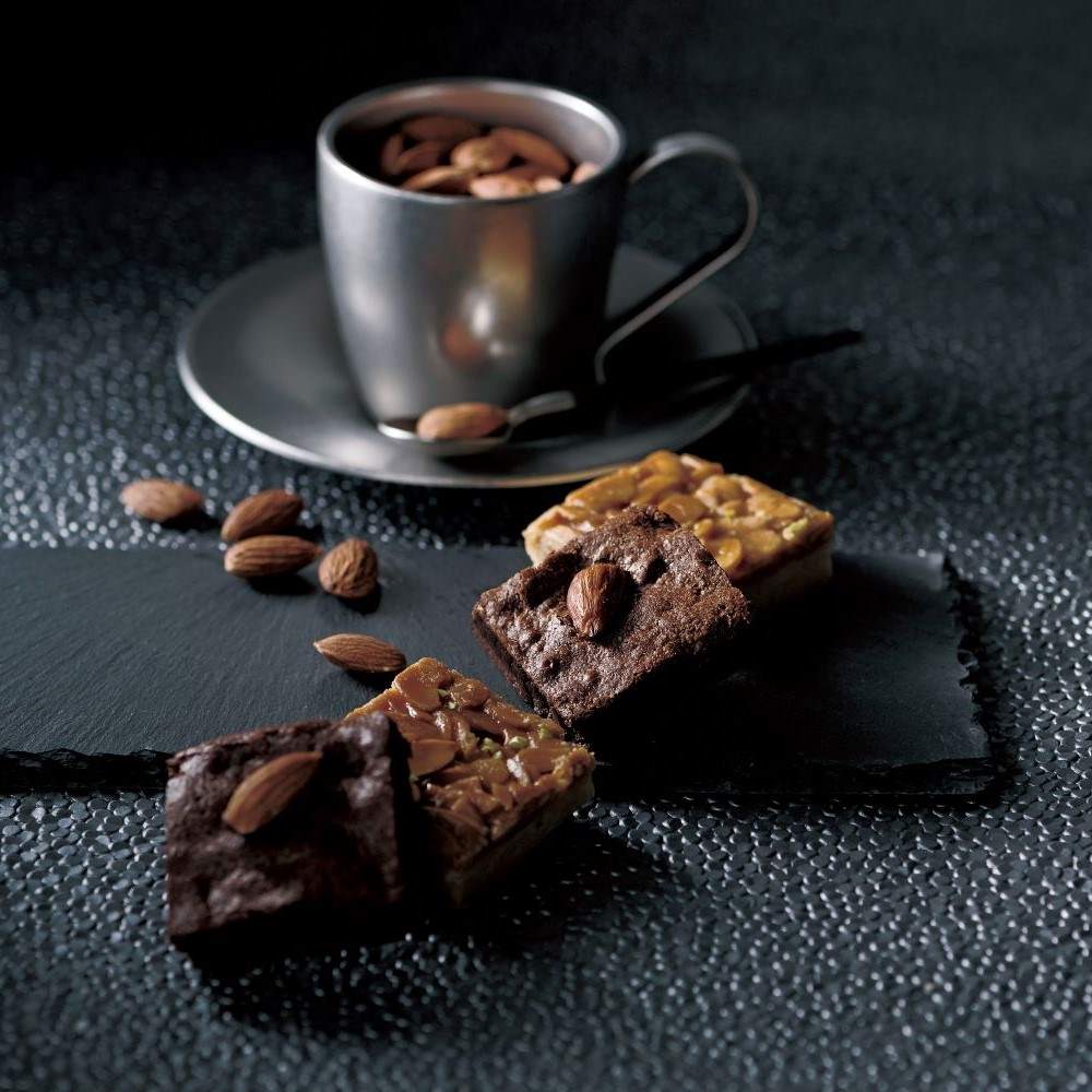 【ブラウニー】準チョコレート(国内製造)、砂糖、マーガリン、小麦粉、クルミ、牛乳、鶏卵、ココアパウダー、アーモンド/酸化防止剤(ビタミンE)、香料、乳化剤、着色料(パーム油カロチン)、酸味料、(一部に小麦・卵・乳成分・アーモンド・くるみ・大豆を含む)【フロランタン】小麦粉(国内製造)、バター、砂糖、アーモンド、アーモンドプードル、鶏卵、調整蜂蜜(はちみつ、ぶどう糖液糖)、乳等を主要原料とする食品、ピスタチオ/pH調整剤、メタリン酸Na、香料、増粘剤(グァーガム)、着色料(パーム油カロチン)、乳化剤、(一部に小麦・卵・乳成分・アーモンド・大豆を含む)