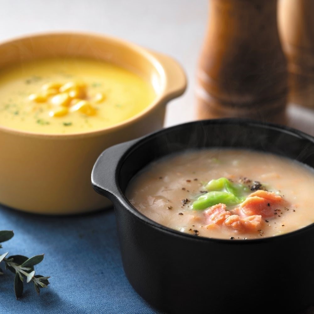 カップの中に閉じ込めた北海道の野菜と海鮮の旨味を手軽に楽しめます。北海道サケとキャべツクリームスープ17.2g×3、北海道トマトとズワイガニクリームスープ16g×3、北海道産かぼちゃス-プ16.5g×1、北海道産玉ねぎス-プ7g×1、北海道産アスパラス-プ16.5g×1