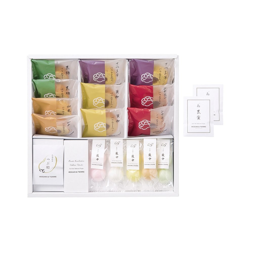 【黄粉バーム】液卵(鶏卵(国産))、小麦粉、砂糖、水飴、ショートニング、マーガリン、コーンスターチ、きな粉、加糖れん乳/ソルビトール、乳化剤、香料、膨張剤、着色料(カラメル、カロテン)、酸化防止剤(V.E)、(一部に小麦・卵・乳成分・大豆を含む)【黒糖バーム】液卵(鶏卵(国産))、小麦粉、砂糖、水飴、ショートニング、マーガリン、コーンスターチ、黒糖加工品(黒糖、還元水飴)、加糖れん乳/ソルビトール、乳化剤、膨張剤、着色料(カラメル、カロテン)、香料、酸化防止剤(V.E)、(一部に小麦・卵・乳成分・大豆を含む)【シナモンバーム】液卵(鶏卵(国産))、小麦粉、砂糖、水飴、ショートニング、マーガリン、コーンスターチ、加糖れん乳、シナモン/ソルビトール、乳化剤、膨張剤、着色料(カラメル、クチナシ、カロテン)、香料、酸化防止剤(V.E)、(一部に小麦・卵・乳成分・大豆を含む)【さつま芋バーム】液卵(鶏卵(国産))、小麦粉、砂糖、水飴、ショートニング、マーガリン、コーンスターチ、サツマイモパウダー加工品(サツマイモパウダー、デキストリン)、加糖れん乳/ソルビトール、乳化剤、膨張剤、香料、着色料(クチナシ、カロテン)、酸化防止剤(V.E)、(一部に小麦・卵・乳成分・大豆を含む)【和栗バーム】液卵(鶏卵(国産))、小麦粉、砂糖、水飴、ショートニング、マーガリン、コーンスターチ、和栗ペースト加工品(果糖ぶどう糖液糖、和栗ペースト)、加糖れん乳/ソルビトール、乳化剤、膨張剤、香料、着色料(クチナシ、カラメル、カロテン)、酸化防止剤(V.C、V.E)、(一部に小麦・卵・乳成分・大豆を含む)【黒蜜】水飴(国内製造)、黒糖、砂糖、食塩/酸味料【最中 赤】最中(もち米(国産)/着色料(赤3、赤106))【最中 白】最中(もち米(国産))【最中 黄】最中(もち米(国産)/着色料(黄4))【最中 焦】最中(もち米(国産))【最中 緑】最中(もち米(国産)/着色料(黄4、黄5、青1))【粒あん】砂糖(国内製造)、小豆、水飴