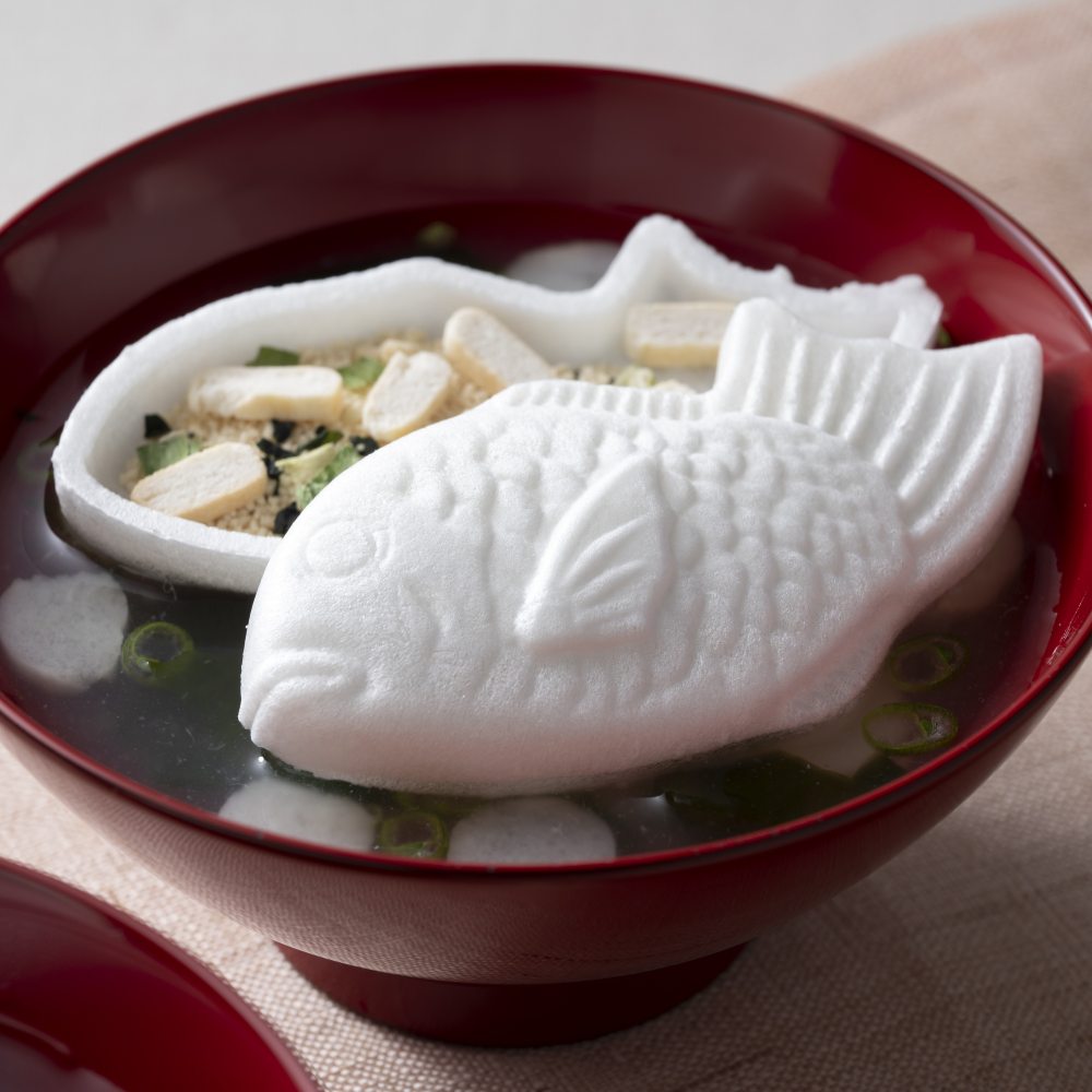 【お吸い物最中(鯛)白】最中(もち米(国産))、食塩、乳糖、ふ、味付鯛フレーク(鯛、食塩、砂糖、デキストリン)、味付鯛粉末(焼鯛、馬鈴薯でん粉、粉末酒)、味付わかめ、いわし節エキス、しょうゆ、発酵調味料、ねぎ/調味料(アミノ酸等)、酸化防止剤(V.E、ローズマリー抽出物)、クエン酸、酸味料、苦味料、(一部に小麦・乳成分・大豆を含む)【お吸い物最中(鯛)赤】最中(もち米(国産))、食塩、乳糖、花麩(小麦粉、小麦たん白)、かつお節粉末、味付わかめ、昆布だし、味付みつば、しょうゆ、魚介エキス調味料、砂糖/調味料(アミノ酸等)、着色料(赤3、赤106、紅麹)、酸化防止剤(V.E)、(一部に小麦・乳成分・大豆を含む)
