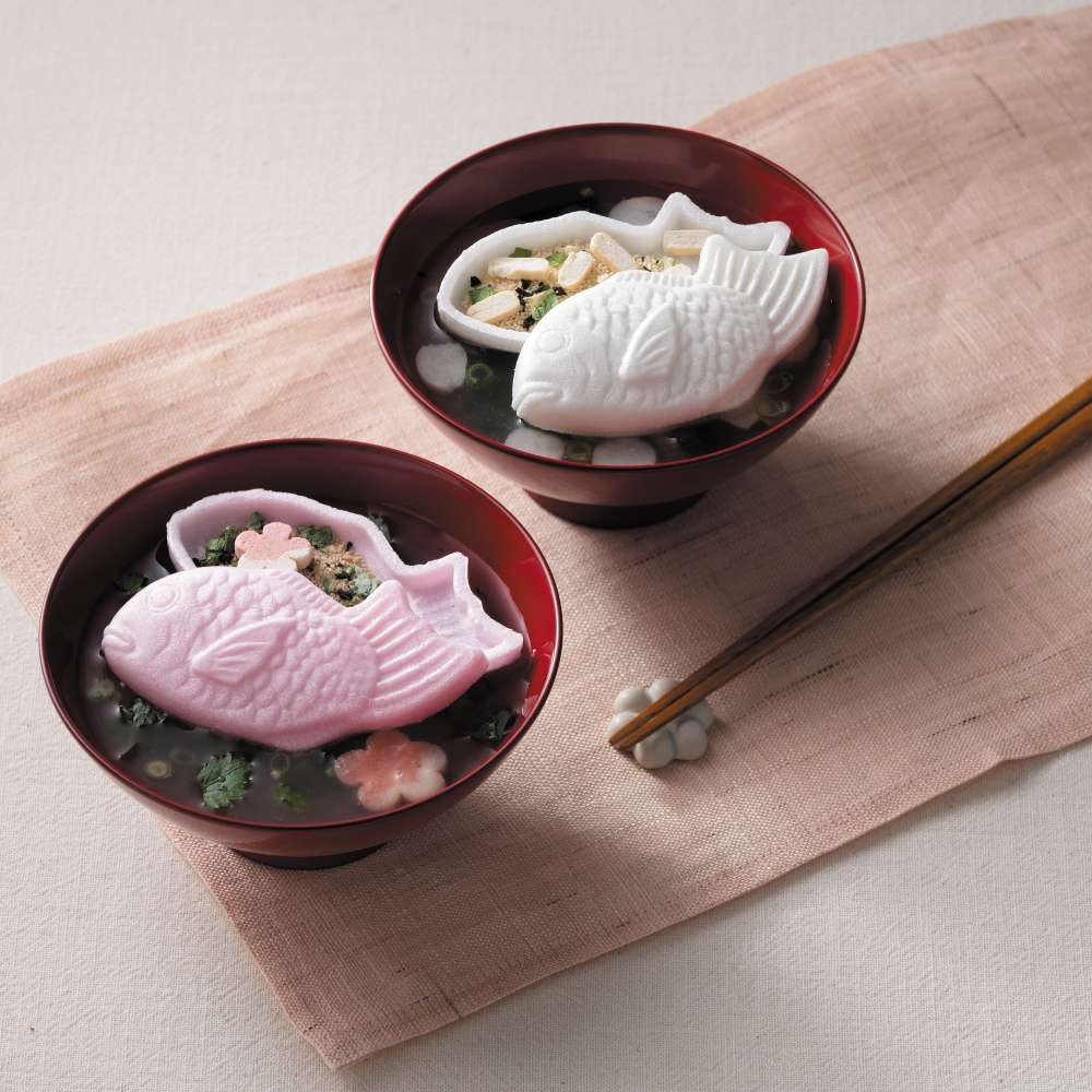 2つの味が楽しめる紅白鯛のお吸い物最中。鯛は長寿の象徴と言われ、縁起が良いとされています。 お吸い物最中(鯛)7.7g×5、お吸い物最中(昆布)7.1g×4※もち米 100%(国産)最中種