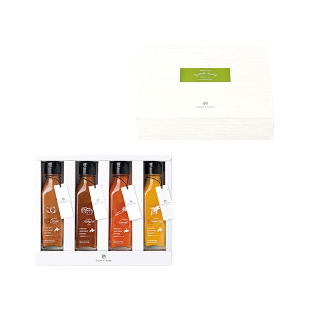 【野菜ドレッシングオニオン】玉ねぎ(国産)、しょうゆ(本醸造)、砂糖、食用植物油脂、醸造酢、本みりん、水飴、チキンエキス、レモン濃縮果汁、りんご濃縮果汁、食塩、酵母エキス、魚介エキス/増粘剤(増粘多糖類)、酒精、(一部に小麦・大豆・鶏肉・りんごを含む)【野菜ドレッシングパンプキン】しょうゆ(本醸造)(国内製造)、玉ねぎペースト、オリゴ糖、食用植物油脂、砂糖、醸造酢、パンプキンパウダー、本みりん、りんご濃縮果汁、チキンエキス、レモン濃縮果汁、酵母エキス、魚介エキス/香料、酒精、pH調整剤、(一部に小麦・大豆・鶏肉・りんごを含む)【野菜ドレッシングキャロット】にんじんペースト(国内製造)、食用植物油脂、オリゴ糖、砂糖、ぶどう酢、食塩、しょうゆ(本醸造)、りんご濃縮果汁、レモン濃縮果汁、チキンエキス、魚介エキス、香辛料/香料、増粘剤(増粘多糖類)、(一部に小麦・大豆・鶏肉・りんごを含む)【野菜ドレッシングスイートコーン】とうもろこしペースト(国内製造)、食用植物油脂、還元水飴、砂糖、しょうゆ(本醸造)、醸造酢、りんご濃縮果汁、チキンエキス、食塩、ぶどう酢、パンプキンパウダー、酵母エキス、魚介エキス/香料、増粘剤(増粘多糖類)、シリコーン、酒精、pH調整剤、乳化剤、着色料(カロテン)、(一部に小麦・乳成分・大豆・鶏肉・りんごを含む)