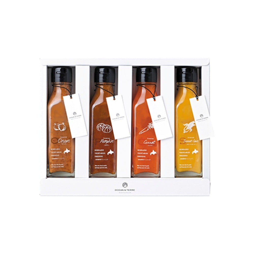 野菜ドレッシングオニオン120ml×1、野菜ドレッシングパンプキン120ml×1、野菜ドレッシングキャロット120ml×1、野菜ドレッシングスイートコーン120ml×1北海道の美味しい野菜で作ったドレッシング