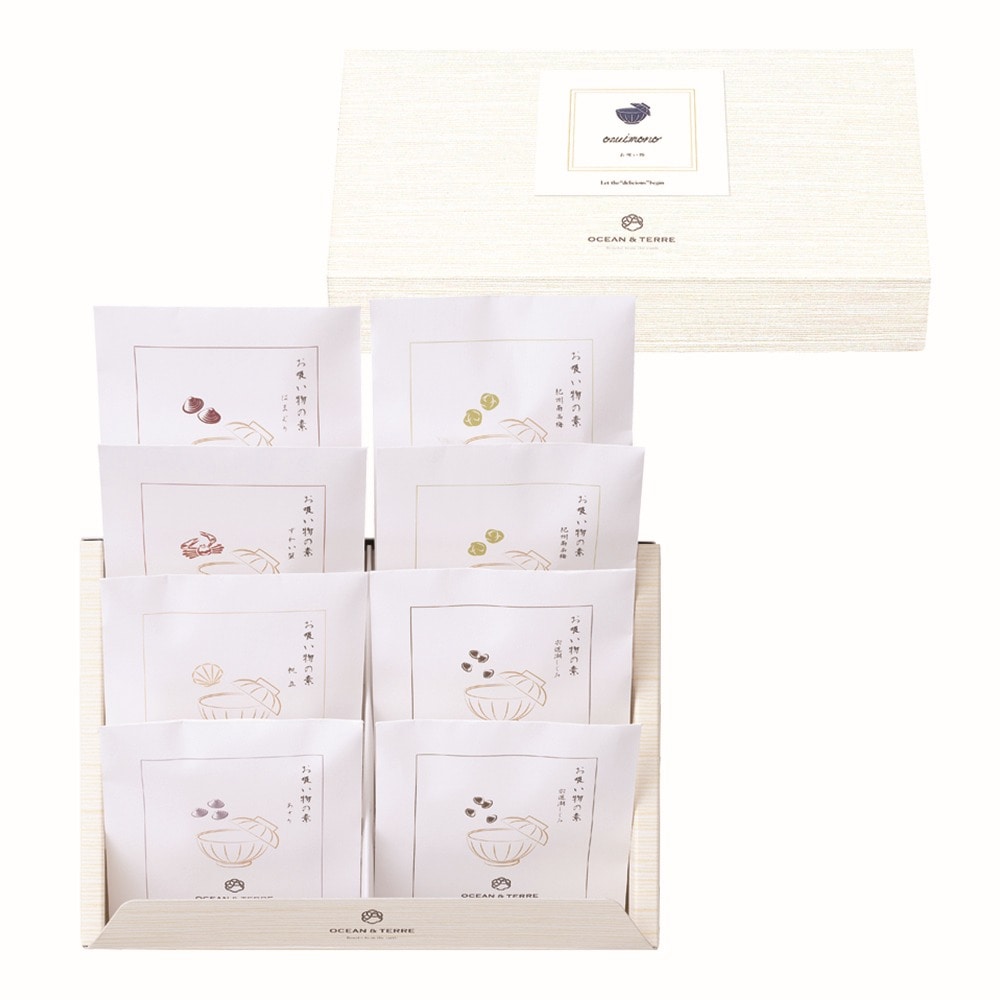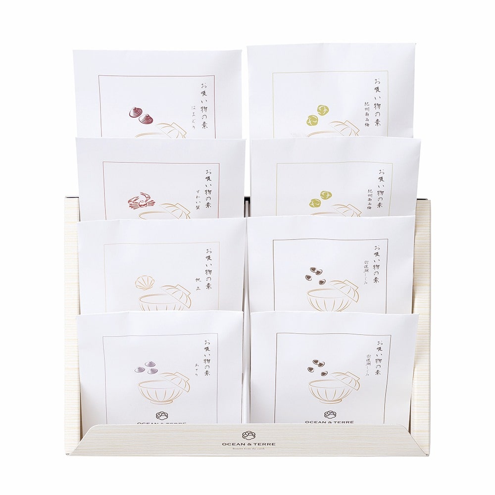 お吸い物の素2.9g×8、はまぐり2個×1、ずわい蟹13g×1、帆立2個×1、紀州南高梅1粒×2、あさり30g×1、宍道湖しじみ30g×2、白煎りごま1g×8 北海道産真昆布を使用し、海鮮で深い旨味を加えた、潮風を感じるお吸い物です。
