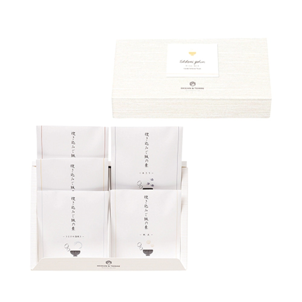 炊き込みご飯の素38g(2合用)×5、ずわい蟹13g×1、金目鯛1切×1、帆立2個×1、うなぎの蒲焼き13g×1、あさり30g×1、三つ葉0.2g×5、白煎りごま1g×5 本醸造醤油をベースに、国産鶏、日高産昆布、焼津産鰹エキスで、風味豊かに仕上げたやさしい味わいです。