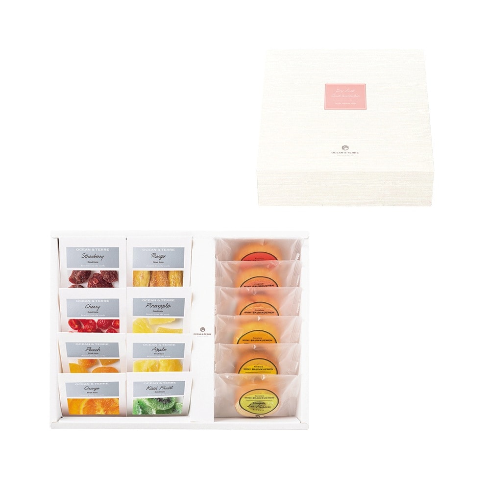 みずみずしさを残したドライフルーツと、大地と太陽の恵みをぎゅっと一層一層に詰め込んだフルーツバームクーヘンのセットです。 ストロベリー20g×1、チェリー20g×1、ピーチ20g×1、オレンジ20g×1、マンゴー20g×1、パイン20g×1、アップル20g×1、キウイフルーツ20g×1、栃木県産 とちおとめ苺バーム×1、山形県産 さくらんぼバーム×1、山梨県産 白桃バーム×1、北海道産 赤肉メロンバーム×1、沖縄県産 マンゴーバーム×1、山形県産 ラ・フランスバーム×1