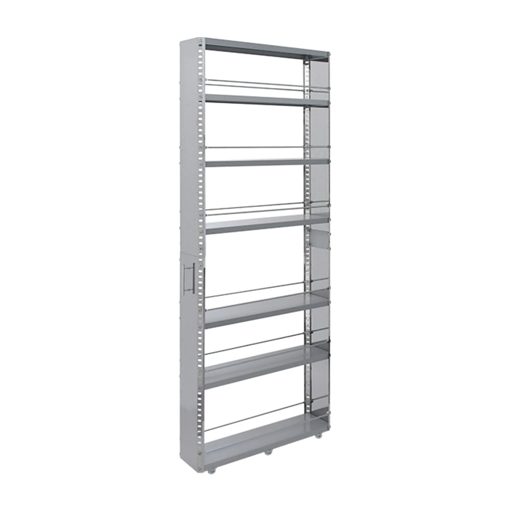 キッチンの狭いスペースも有効活用できる日本製のすき間収納ワゴンです。 前後のパネルはステンレス仕様で高級感があります。 本体と棚板の固定穴は2cmピッチで変更可能です。 前後に動くキャスター付きで、移動もラクラクです。 付属品で転倒防止金具がついています。