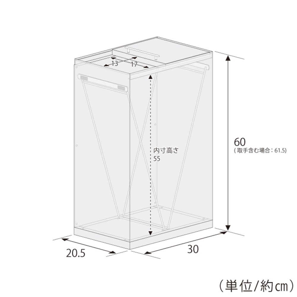 本体:約幅30×奥行20.5×高さ60cm (取手を含む高さ:約61.5cm) 袋枠内寸:約幅27.2×奥行15.8×高さ55cm フタの開口:13×17cm 梱包時:約35×26×高さ65cm 重量:約4.2kg (梱包時:約5kg)