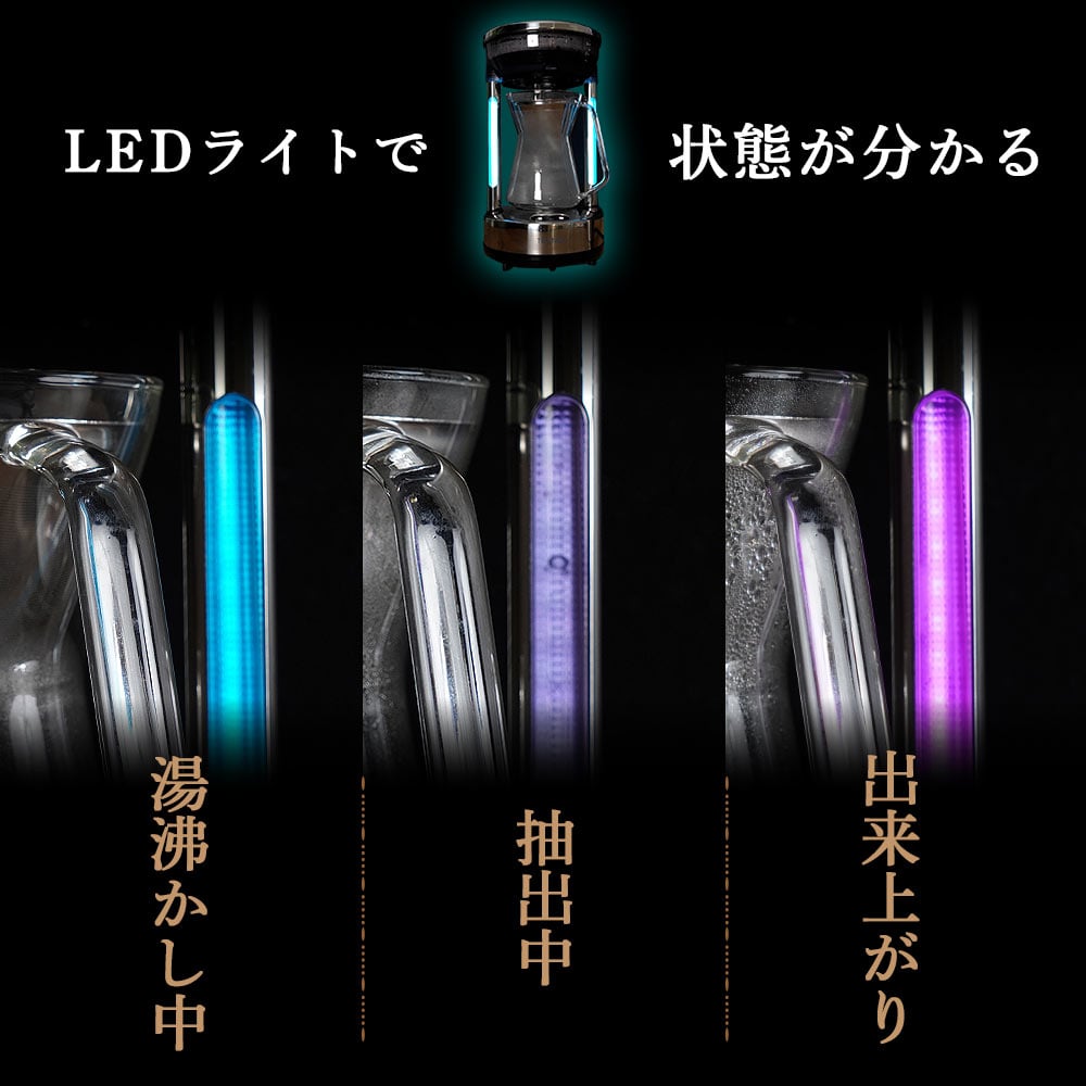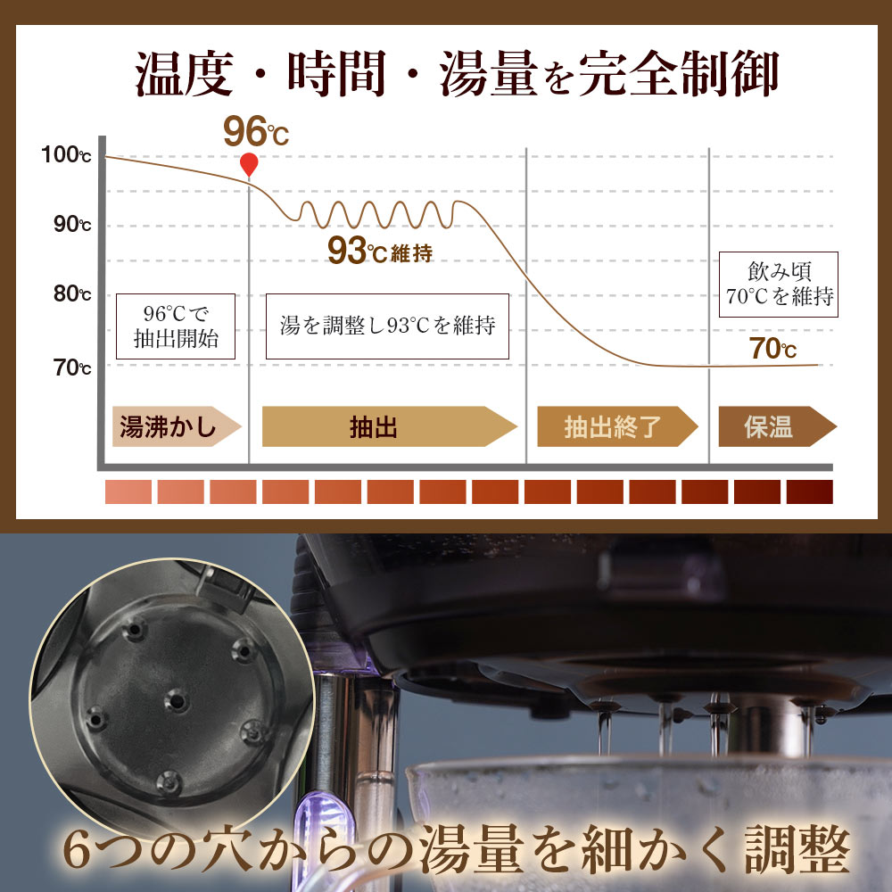 コーヒーは同じ豆でも淹れ方によってあきらかに味が変わります。 バリスタがハンドドリップで淹れたコーヒーの味を、自宅で簡単に楽しめるのが「96度ハンドドリップコーヒーメーカー」です。 コーヒーのプロがこだわる「Golden extraction temperature」(ゴールデン抽出温度)を正確に管理。 蒸らし、回して淹れるお湯の注ぎ方など、プロの手順そのままで雑味やブレのない安定した美味しさを実現しました。 ボタンを押すだけでいつでも最高に美味しいコーヒーを飲むことができる「96度ハンドドリップコーヒーメーカー」。 本物のコーヒーを味わって頂けます。