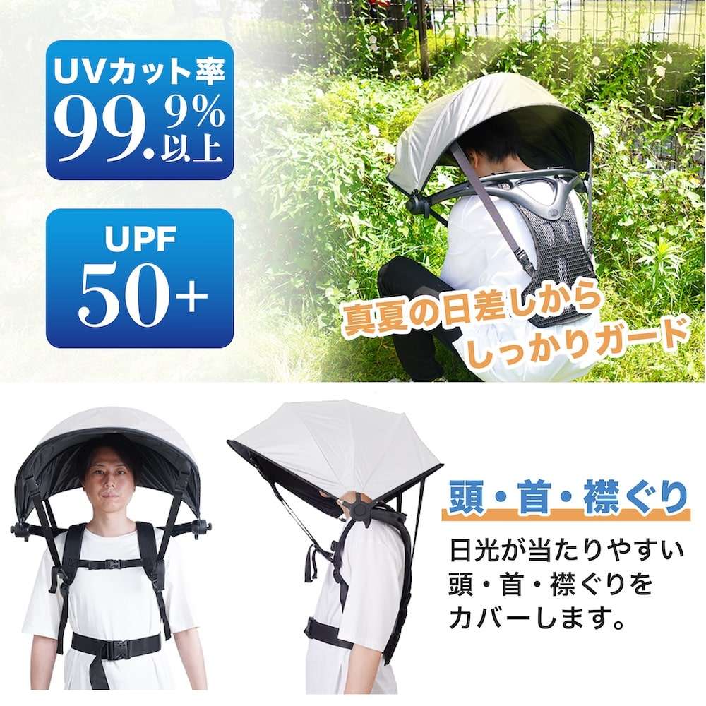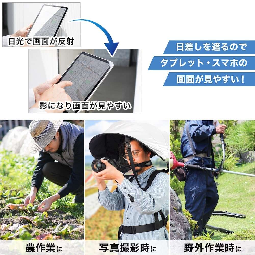炎天下での作業時には、熱中症対策が必須です。 強い日差しを防ぎたくても、日傘を差すと片手がふさがってしまったり、帽子だと日陰になる範囲が狭かったりと完全に日差しを防ぐのが難しい場合があります。 ハンズフリー背負える日傘は、リュックのように傘を背負うことで、両手が完全にフリーに! 大きい傘が頭から肩まで覆い、紫外線を99.9%カットしてくれます。 屋外作業でタブレットを見るとき、画面が反射して画面が見にくいことがあります。 ハンズフリー背負える日傘があれば手元が影になるので、タブレットやスマホの画面が見やすくなります。 ガーデニングや写真撮影など、両手を使う作業を日傘を差しながら行うことができます。 ハンズフリー背負える日傘の傘部分は折りたたむことが可能です。 背中に触れる部分はメッシュになっていて通気性がよく、持ち運ぶこともできます。 また雨の日の雨避けとしても使用することができます。