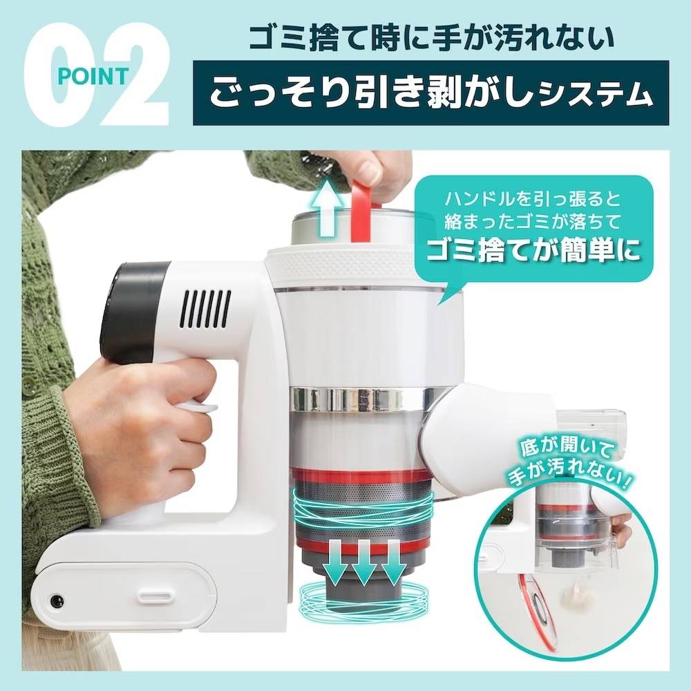 Wローラーで壁際のゴミまでしっかり吸い込むサイクロン式掃除機「マキトルン」。特殊形状のWローラーヘッドがすみっこのゴミを掻き出し、部屋の隅々まで綺麗に掃除できます。独自タンク構造により、ハンドルを引くだけでフィルターに絡む髪の毛などをごっそり除去でき、手を汚さずにお手入れ可能。すみっこ巻き取りシステムと、ごっそり引き剥がしシステムのWシステムで快適な掃除を実現し、ペットの抜け毛が気になる家庭にも最適です。モードはAUTO/MIN/MID/MAXの4段階で、自動モードはゴミ量に応じて吸引力を調整。LEDライト、ブラシ付きノズル・隙間ノズル、ディスプレイ、取り外し式バッテリーなど便利機能も搭載。ローラーは取り外せ、ダストカップやフィルターは水洗いできるため清潔に保てます。