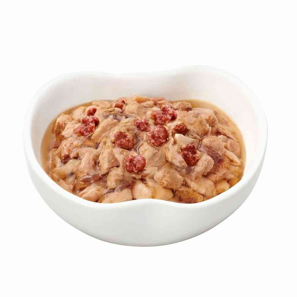 魚介類(カツオ、マグロ、青魚、フィッシュペプチド)、肉類(牛肉、鶏肉)、油脂類(鶏脂、大豆油)、たんぱく加水分解物、小麦グルテン、糖類(ショ糖、オリゴ糖)、乾燥全卵、エンドウたんぱく、乾燥卵黄、増粘安定剤(加工でん粉、増粘多糖類)、調味料、ミネラル類(Ca、P、Fe、Cu、Mn、Zn、I、Se)、ポリリン酸Na、キシロース、ビタミン類(A、D、E、K、B1、B2、B6、B12、ナイアシン、パントテン酸、葉酸、ビオチン、コリン)、タウリン たんぱく質:6.8%以上、脂質:1.5%以上、粗繊維:0.1%以下、灰分:2.8%以下、水分:86.2%以下