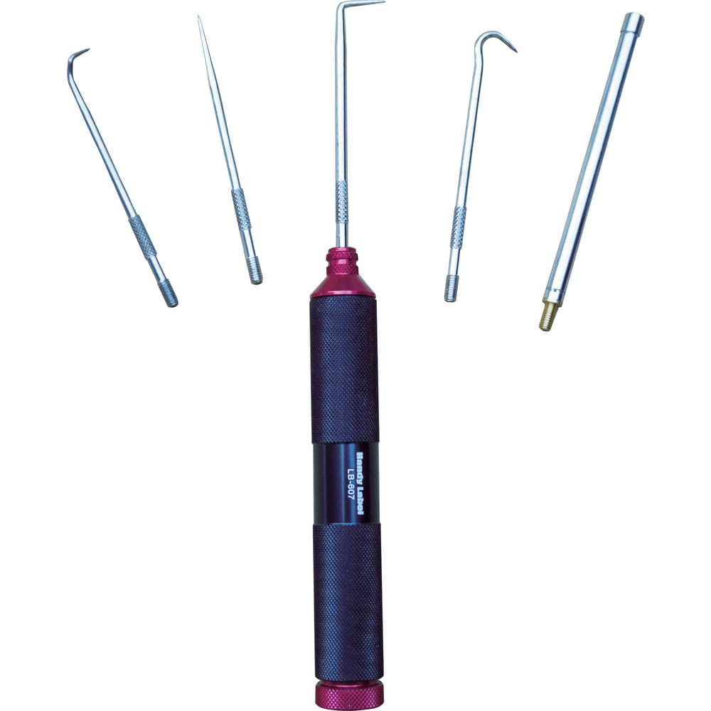 ●Oリングなど細かなパーツの取り外し、あるいは落としたビス類のキャッチアップまでできる大変便利なツールです。●5種の先端ピックを付け替えて使用できます。(4種ニードル状、1種マグネット)●5種類の先端部を本体内に収納できます。●全長(mm):197●軸長(mm):各75●軸径(mm):3.5●セット内容(点):6●グリップ本体全長(mm):127●タイプ:差替え式●ハンドル長(mm):127●グリップ:φ19●伸縮マグネットバー(mm):φ6.0x90(~390)●先端ピック:M3.5(4種)●ピック長(mm):75 質量70.000g