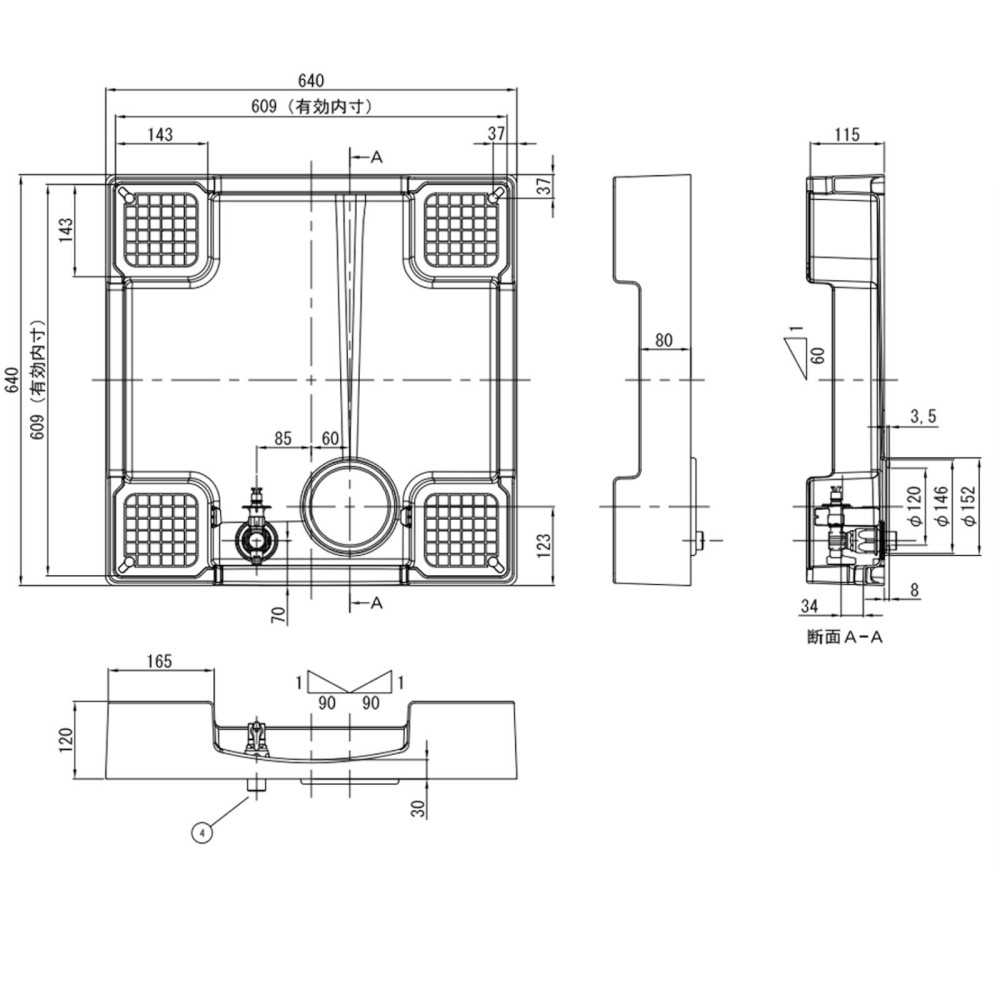 サイズ:W640×D640×H120 (有効内寸:W609×D609)、重量:約3.4kg