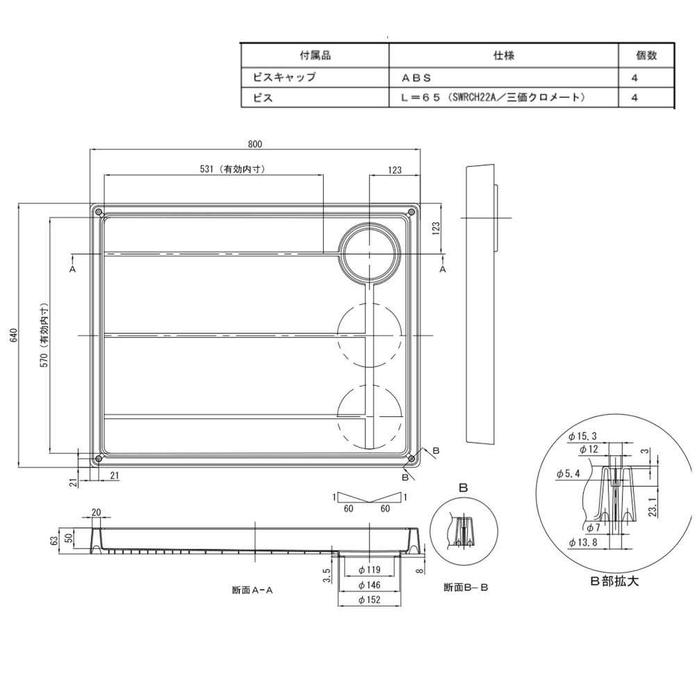 サイズ:W800×D640×H63 有効内寸 (C:W620×D570、L/R:W531×D570) 排水口位置:中央(C)、左穴(L)、右穴(R)、重量:約2.5kg
