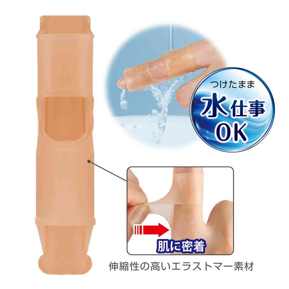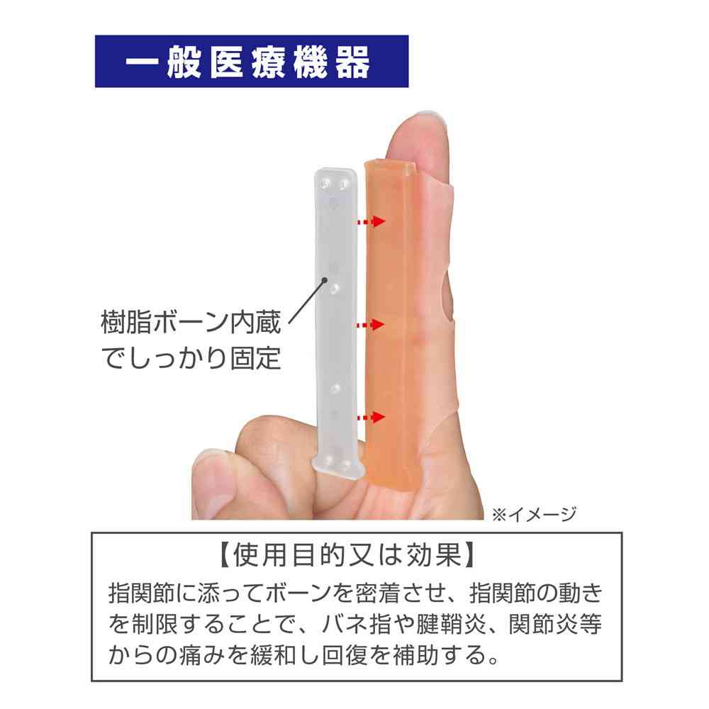 指腱鞘炎・バネ指などの痛みを緩和する一般医療機器の指サポーターです。 動かすと痛い指関節を内蔵ボーンが指を真っすぐ支えることで痛みを緩和し、症状からの回復を補助します。 撥水性に優れた伸縮性の高いゲル素材なので、装着したまま水仕事も可能です。