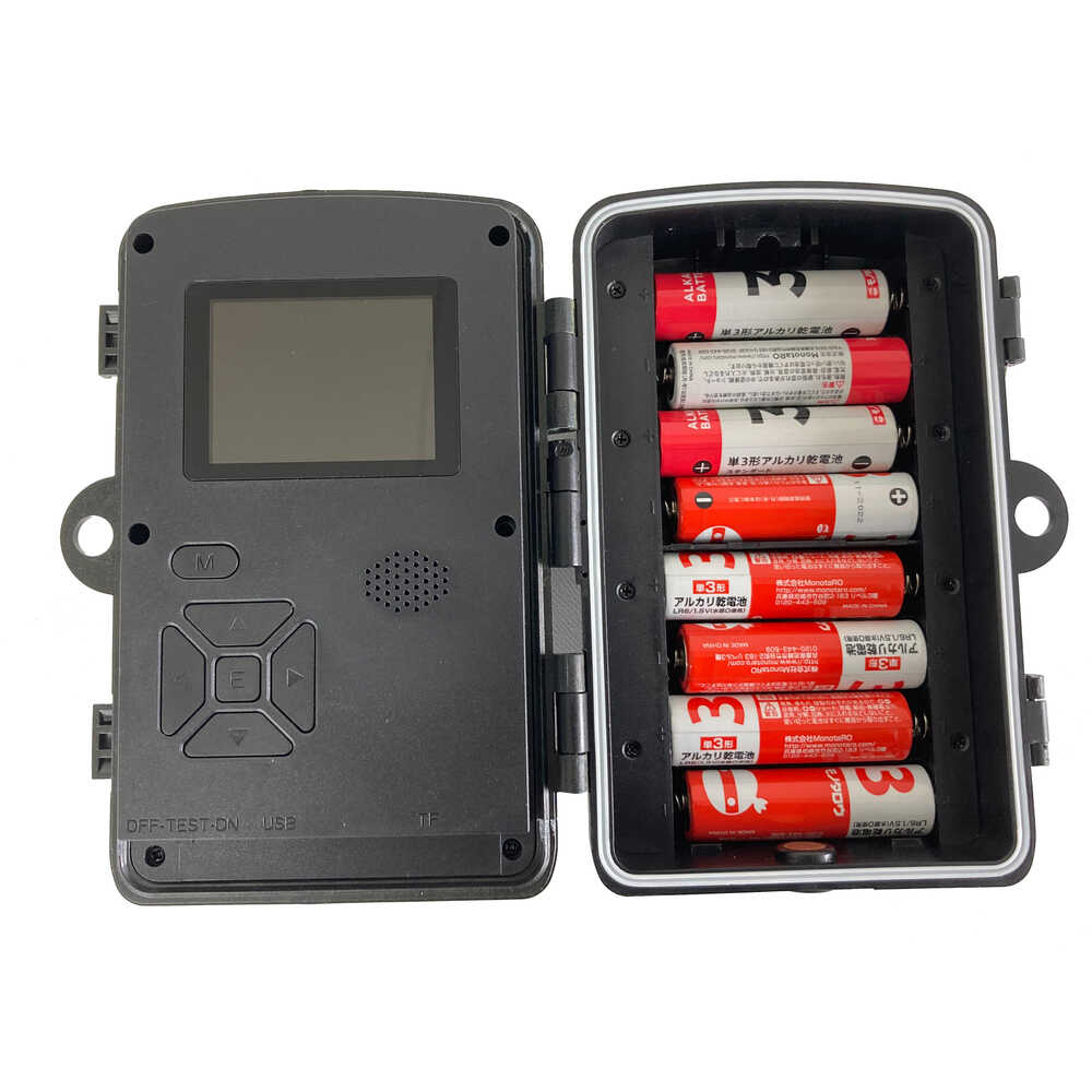 ●熱感知で作動する乾電池式のセキュリティーカメラです。●防水等級IP66ですので、屋内外、昼夜問わずに動画・静止画の撮影ができます。●本体内部に2インチ液晶モニターが付いており、その場で映像・写真を確認できます。●CMOS解像度130万ピクセル、32GBのSDカード対応です。●写真、映像、写真+映像の3種類を選択でき、時間・タイマー動作なども設定可能です。●幅(mm):99●奥行(mm):64●高さ(mm):135●最大画素数(万):130●タイプ:2インチモニター付●インターフェース:miniUSBポートmicroSDカードスロットDC6V2A電源差込口●使用電池:単3形アルカリ乾電池8本または4本(電池は付属しておりません)●待機消費電力:0.15mA(単3形アルカリ乾電池8個で約8ヶ月/4個で約4ヶ月)●取り付け:付属の取り付けベルト●センサー感知距離:10~13m(環境温度約25度平均温度で)●センサー感知角度:約60°●作動環境:屋内屋外(昼カラー/夜モノクロ撮影)●感知後撮影開始時間:約0.8秒●作動間隔時間:5秒~30分を設定可能 質量256g