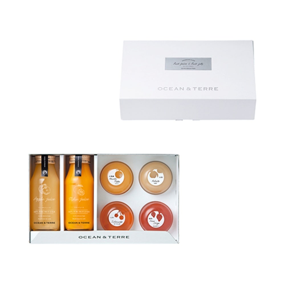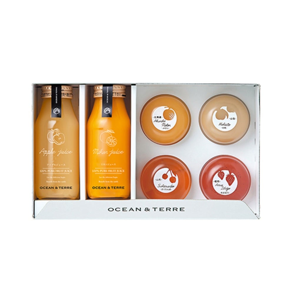 アップルジュース180ml×1、ミカンジュース180ml×1、北海道 赤肉メロンゼリー72g×1、山形県 さくらんぼゼリー72g×1、山梨県 白桃ゼリー72g×1、福岡県 あまおうゼリー72g×1 本格ジュースと可愛らしいゼリーのセットです。