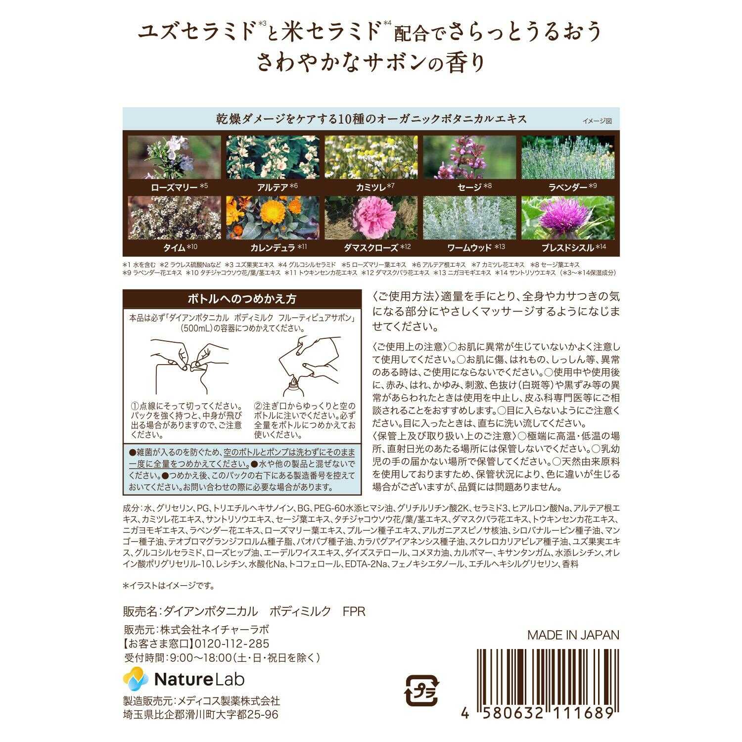●全身にさらっと浸透してしっかり潤いを与える、90%以上天然由来成分のボディミルク。 ●植物から生まれたボタニカルセラミドや植物由来オイルを配合し、親子で使える優しさにこだわりました。さわやかなサボンの香り。 ●ユズセラミド・米セラミド配合 ●乾燥ダメージをケアする10種のオーガニックボタニカルエキス配合 ●シリコン・パラベン・石油系界面活性剤・合成色素・鉱物油・エタノール・動物性原料フリー