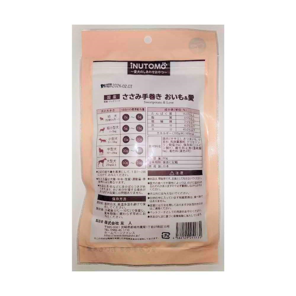 鶏肉(ササミ)、さつまいも、小麦粉、馬鈴薯澱粉、グリセリン、リン酸塩(Na)、保存料(ソルビン酸K)、酸化防止剤(亜硫酸Na)、着色料(黄色4号) たんぱく質15.0%以上、脂質0.5%以上、粗繊維2.5%以下、灰分6.0%以下、水分45.0%以下、 エネルギー(100g中)165Kcal