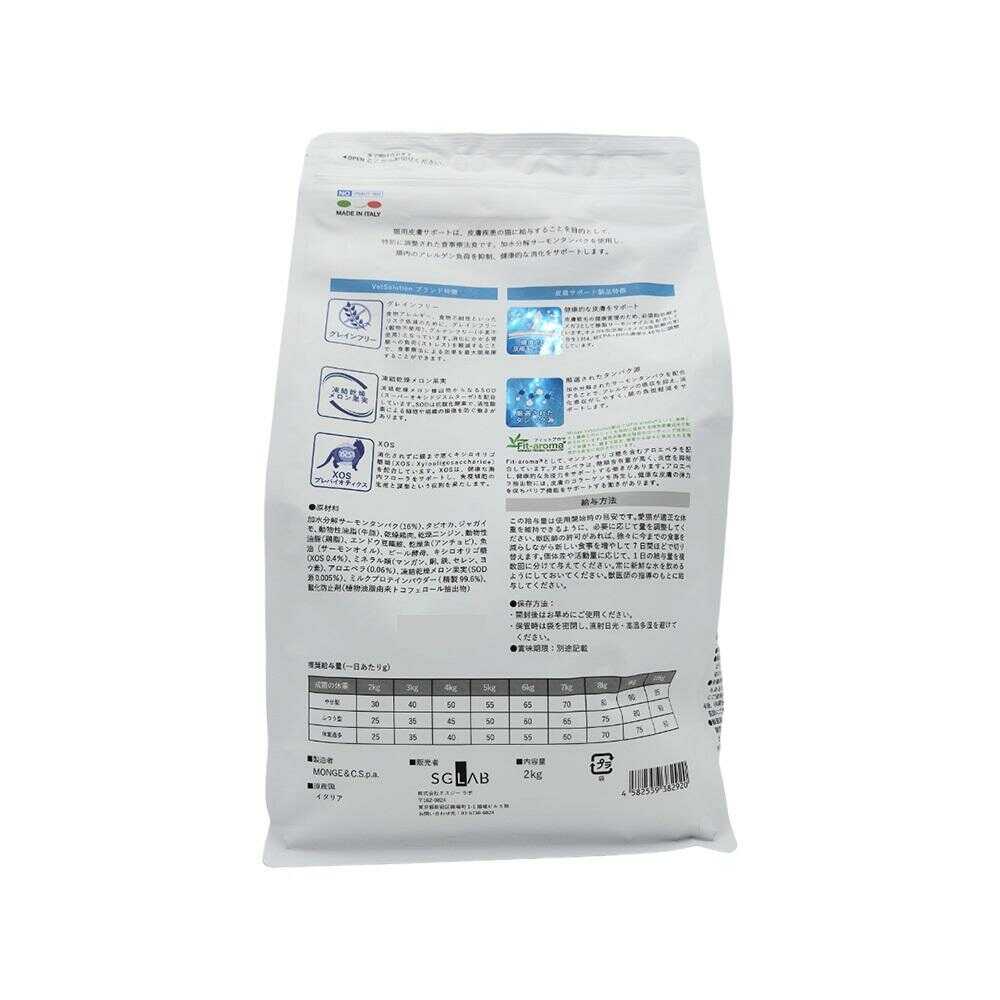 猫用皮膚サポートは、皮膚疾患の猫に給与することを目的として、特別に調整された食事療法食です。 加水分解サーモンタンパクを使用し、腸内アレルゲン負荷を制御、同時に消化しやすく調整されています。 炎症性皮膚疾患のコントロール、皮膚・被毛の健康維持のためにオメガ3を配合しています。
