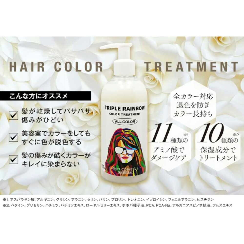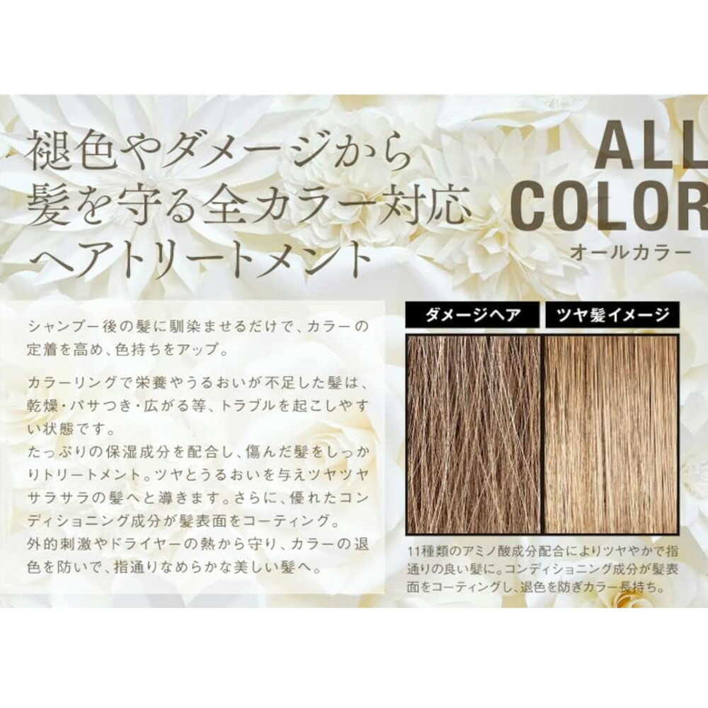 11種類のアミノ酸×10種類の保湿成分がカラー後の傷んだ髪に潤いやツヤを与えます。 トリートメント成分が髪表面をコーティングすることで褪色を防ぎ、美しい髪色を持続させます。