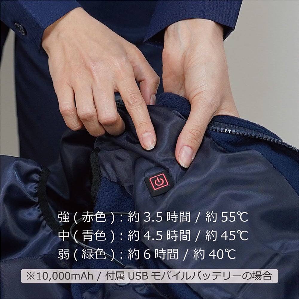 ●発熱配線に東レの高性能炭素繊維トレカ糸を採用し、素早い熱の伝導性を高めるとともに、安定した発熱により安全性を高めたシックなデザインの発熱ベストになります。●保温性の高いフリース素材を採用することで、見た目にもカジュアルな着心地を実現。●両脇は伸縮性に富んでおり、動作に合わせフィット感を向上させ熱を逃がさない構造です。●色:ネイビー●サイズ:3L●着丈(cm):65●胸囲(cm):114●肩幅(cm):40●目安稼働時間:強(赤色):約3.5時間/約55度、中(青色):約4.5時間/約45度、弱(緑色):約6時間/約40度●適合機種:出力5V2A以上のUSB-Aコネクタのモバイルバッテリー●電圧(V):充電:5/2.1A / 放電:5/2.1A (付属バッテリー)●容量(Ah):10000(USBモバイルバッテリー)●電源(V):5 質量650g