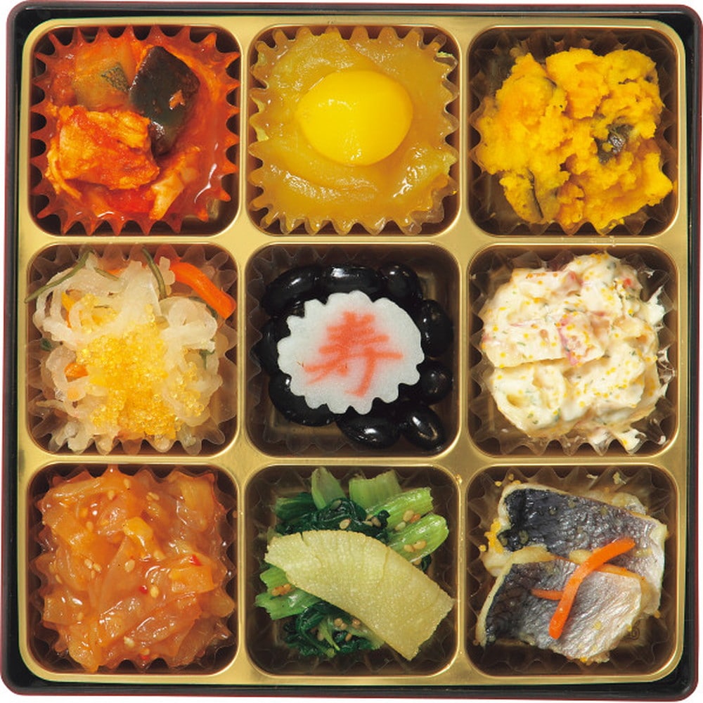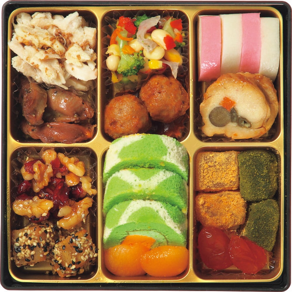 ●<壱之重>20品:伊達巻、有頭中むき海老、キャロット・ラペ、スライスレモン、ボロニアソーセージ、スライスブラックオリーブ、合鴨ローススライス、若桃甘露煮、珈琲煮豆、ミニッツチーズサーブ、イタリアンソーセージ、ボイルブロッコリー、ぶり照焼、たたきごぼう、紅あずま甘露煮、花形人参、椎茸香煮、蓮根旨煮、きぬさや、寿高野豆腐<弐之重>14品:蒸し鶏ごまだれ和え、砂肝レモン&ペッパー、豆とブロッコリーのサラダ、肉団子デミソース、かまぼこ(白)、かまぼこ(紅)、チキン三色巻、ごまポテ紅はるか、クランベリーくるみ飴炊き、メロンロールケーキ、杏子白ワイン煮、わらび餅風きなこ、わらび餅風抹茶きなこ、ドライトマト赤ワイン煮<参之重>13品:蒸し鶏と野菜のトマトソース和え、栗甘露煮、さつま芋きんとん、かぼちゃサラダ、黄金とびっこ、彩り大根なます、寿かまぼこ、黒豆煮、北寄貝サラダ、味付け中華くらげ、味付け数の子、小松菜のナムル、にしん甘酢漬●温度帯:冷凍●商品お届け日:12月29日(月)