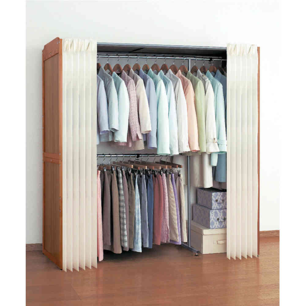 高級感のある側板を使用した伸縮式クローゼットハンガー。 ●壁面を利用した伸縮自在の大量収納ハンガー。 ●アジャスター付き。 ●カーテン付きなので衣類をホコリから守り、中身も見えません。 ●お部屋のスペース、衣類の収納量に合わせて、最大約190cmまで伸縮可能なハンガー。 ●中段にスーツやジャケット等が掛けられるハンガーバーが付いてさらに収納力がアップ! ●ロングコートも収納できる余裕の収納力! ●下にバッグ等が置けます。 ●お客様組立式 ※上段バーから中段バーまでは約81.5cmです。