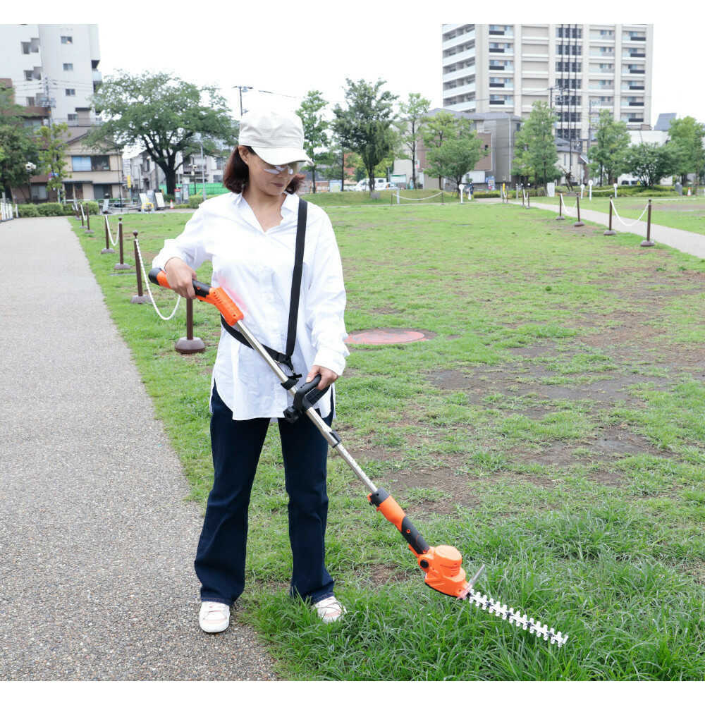 生垣も草刈りも楽な姿勢でなぞるだけで簡単に剪定できます。 ●場所を選ばず作業ができるコードレスタイプ。 ●伸張パーツをつけて高枝にも対応し、はずせばハンディーとしてお使いいただけます。 ●バリカン刃の角度も変更できて、生垣の上部もラクラク剪定。 ●伸張パーツをつけても軽量1.65kg(生垣バリカン刃・伸張パーツ取り付け時)。 ●肩ベルト、取っ手、保護メガネまでつけた9点セット。 ●一部組立式 [仕様] ●電源:12V充電式 ●充電時間:約60分 ●連続使用時間:約20分 ●バッテリー容量:約1,500mAh ●回転速度:約18,500回/分 ●モーター仕事率:約300W ●刃のストローク回数:約3000回/分 [セット内容] 本体、伸張パーツ、ガード、生垣バリカン刃(30cm)、ACアダプター、12Vバッテリー、肩ベルト、取っ手、保護メガネ ●6カ月間保証書付き