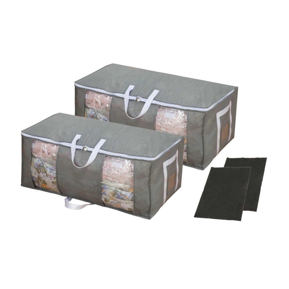 圧縮袋と収納ボックスが一体化 ●専用吸引機で簡単圧縮 ●おしゃれな窓付き収納ボックスに圧縮袋が内蔵された大容量かつ見せる収納ボックス!ベッド下のごちゃごちゃや見栄えも解消。 ●収納ボックスは底面、側面に型紙が内蔵されているので、重ね置きも可能。 ●長期保管も安心の専用の抗菌防臭防ダニ効果の竹炭シート付き。 ●布団はもちろん、こたつ布団、座布団、カーペット、厚手の衣類からぬいぐるみなど全部圧縮して押入れを整理整頓。 ●使わない時は折りたたんで引き出しや空きスペースにしまえます。 ●収納目安:セーター・トレーナー20~30枚、シングル掛け布団2~3枚 [セット内容] 収納ボックス2個(圧縮袋2個付き)、竹炭シート2枚 ※吸引機別売