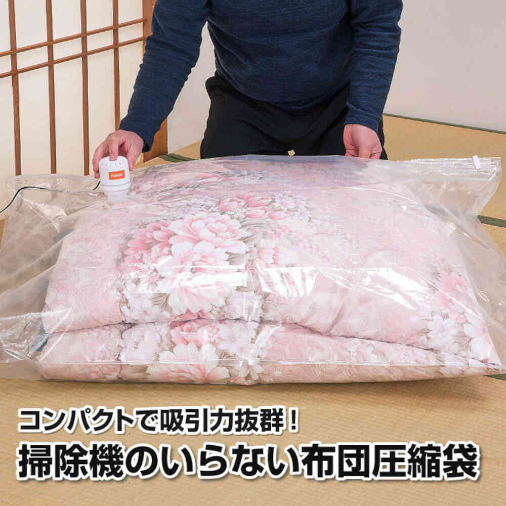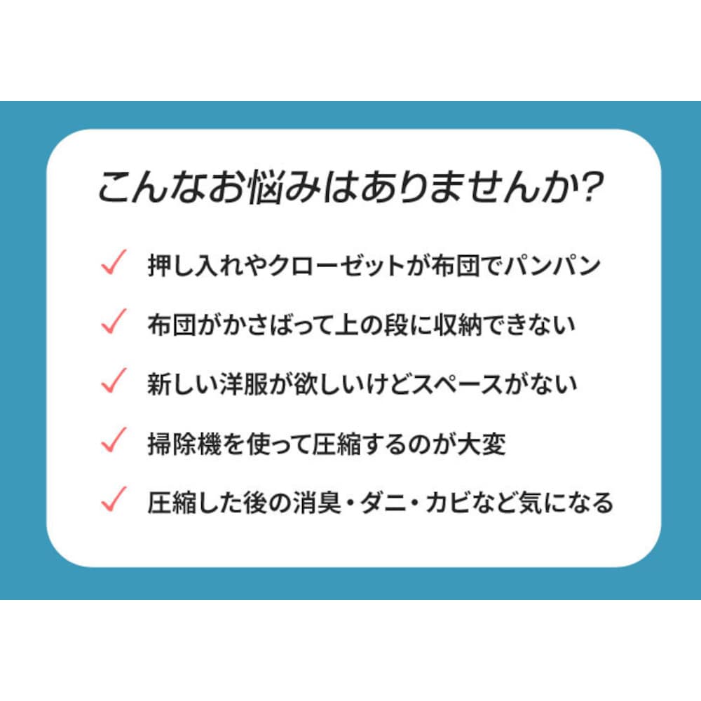 掃除機を使わず手軽に素早く圧縮!専用吸引機と圧縮袋の特別セット。 ●間口の広い2サイズの圧縮袋は、かさばる布団の出し入れが楽々。二重チャック採用で、空気漏れを防ぎ、密封性に優れた仕様です。 ●専用吸引機付き。小型ながら吸引力抜群! ●バルブに専用吸引機を当てるだけ!! ●寝具・座布団・衣類・ぬいぐるみ ●広くて使いやすい間口/Mサイズ:120cm幅、Lサイズ:150cm幅 ●押し入れにパンパンにつまったお布団もスッキリ! ●布団・クッション、毛布・枕、季節外れの服、来客用品 ●2大特典がついた豪華27点セット ●2大特典の内容:消臭・カビ・ダニを抑制する竹炭シート。旅行に便利な衣類圧縮袋、くるくるっと巻いて圧縮! [仕様] ●電源:AC/100V(50/60Hz) ●消費電力:30W ●コードの長さ:約1m [セット内容] 専用吸引機、Mサイズ圧縮袋8枚、Lサイズ圧縮袋4枚、竹炭シート12枚、衣類収納袋2枚 ●6ヵ月保証書付き(吸引機のみ)