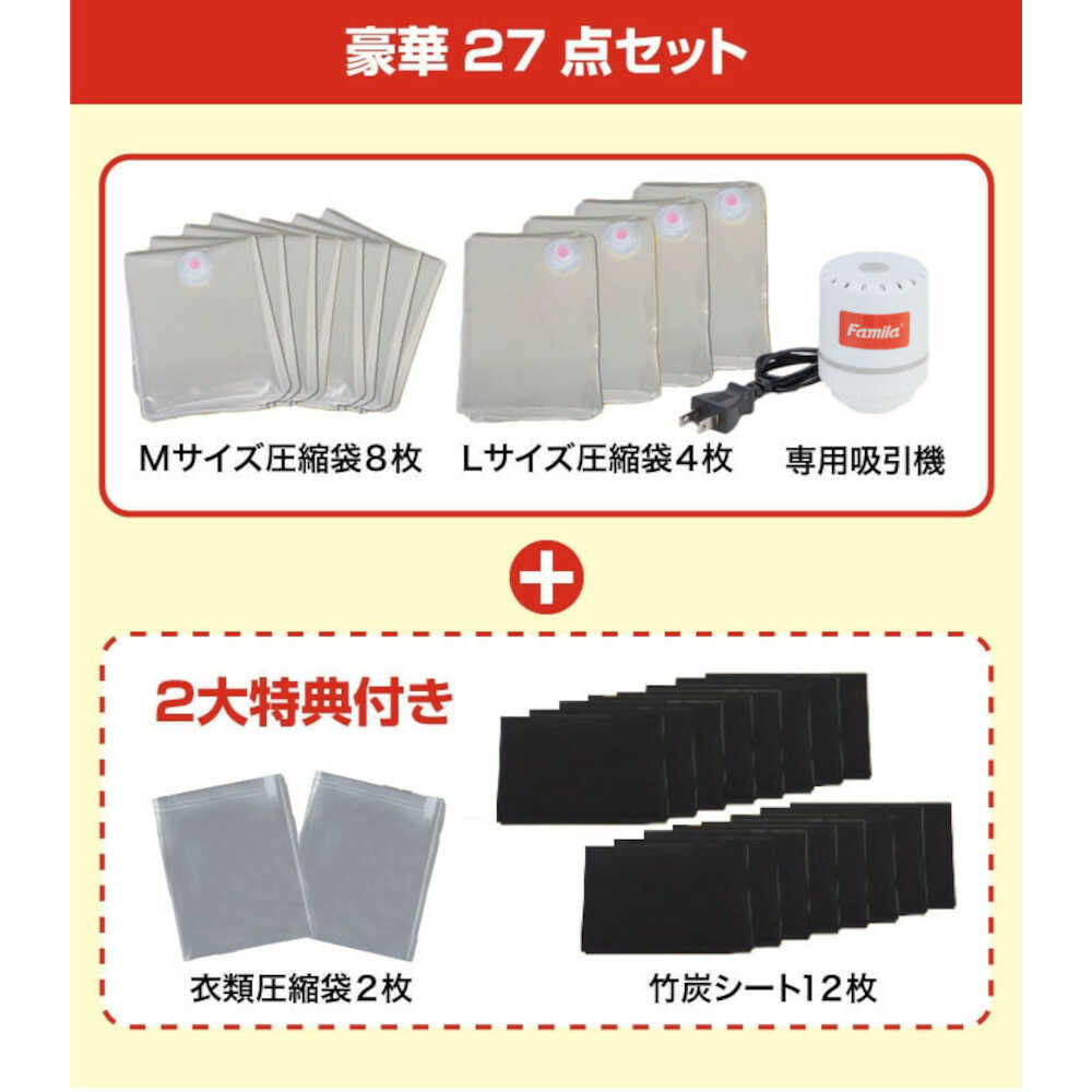 ファミラ 掃除機不要 布団収納 圧縮袋セット 専用吸引機1個 Mサイズ圧縮袋8枚 Lサイズ圧縮袋4枚 竹炭シート12枚 衣類収納袋2枚