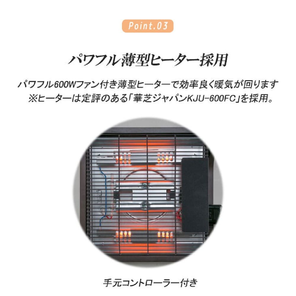 冬はこたつ、春~秋はダイニングテーブルで一年中大活躍! ●布団は独特の凹凸で肌触りのやさしいしじら織の面と撥水加工を施したフランネル面のリバーシブル仕様。リモコンが入るポケット付き。フランネル面は撥水加工仕様。 ●チェアの背もたれはソファのようなボリューム感。360度回転式。熱が逃げない仕切り板付き。 ●効率よく暖気が回るパワフル600Wファン付き薄型ヒーター。便利で使いやすい手元コントローラー。天板は角を取りやさしい丸みのあるデザイン。 ●一部組立式 [仕様] ●電源:AC100V(50/60Hz) ●消費電力:600W ●発熱体:石英管ヒーター300W×2本 ●温度調節方式:無段階調節、ファン付き ●コードの長さ:約2.8m(手元コントローラー付き) [セット内容] テーブル、布団、チェア2脚 ●1年間保証書付き(ヒーター)