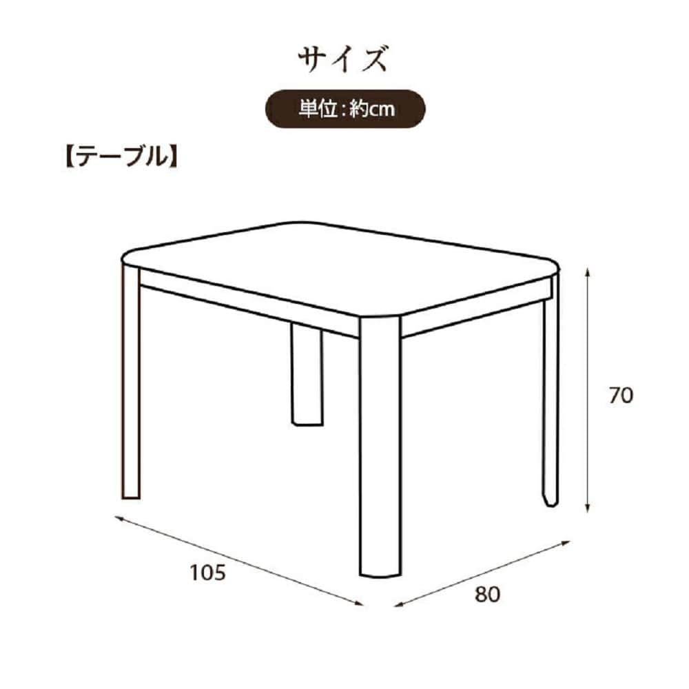 [テーブル]こたつ:(フレーム・脚)ラバーウッド材・(天板)MD転写、[布団]表地:綿100%(しじら織)、フランネル:ポリエステル100%(撥水フランネル)、中綿・コーナー部:ポリエステル100%、[チェア]フレーム:天然木ラバーウッド材、座面:PVC・ウレタンフォーム