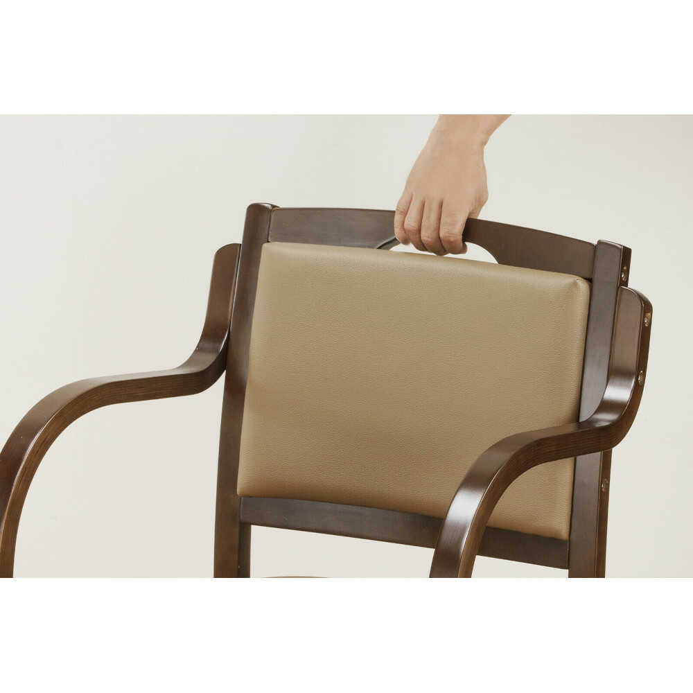 曲木のウッド脚フレームで美しいデザインの天然木ダイニングチェア。 ●座面は大きく前に垂れた疲れにくい形状になっています。 ●汚れもきれいに拭き取れる張り地を使用。 ●肘掛けはつかみやすい加工で最大4脚まで重ねが可能です。 ●背もたれは持ち運びに便利な持ち手付き。 ●お客様組立式