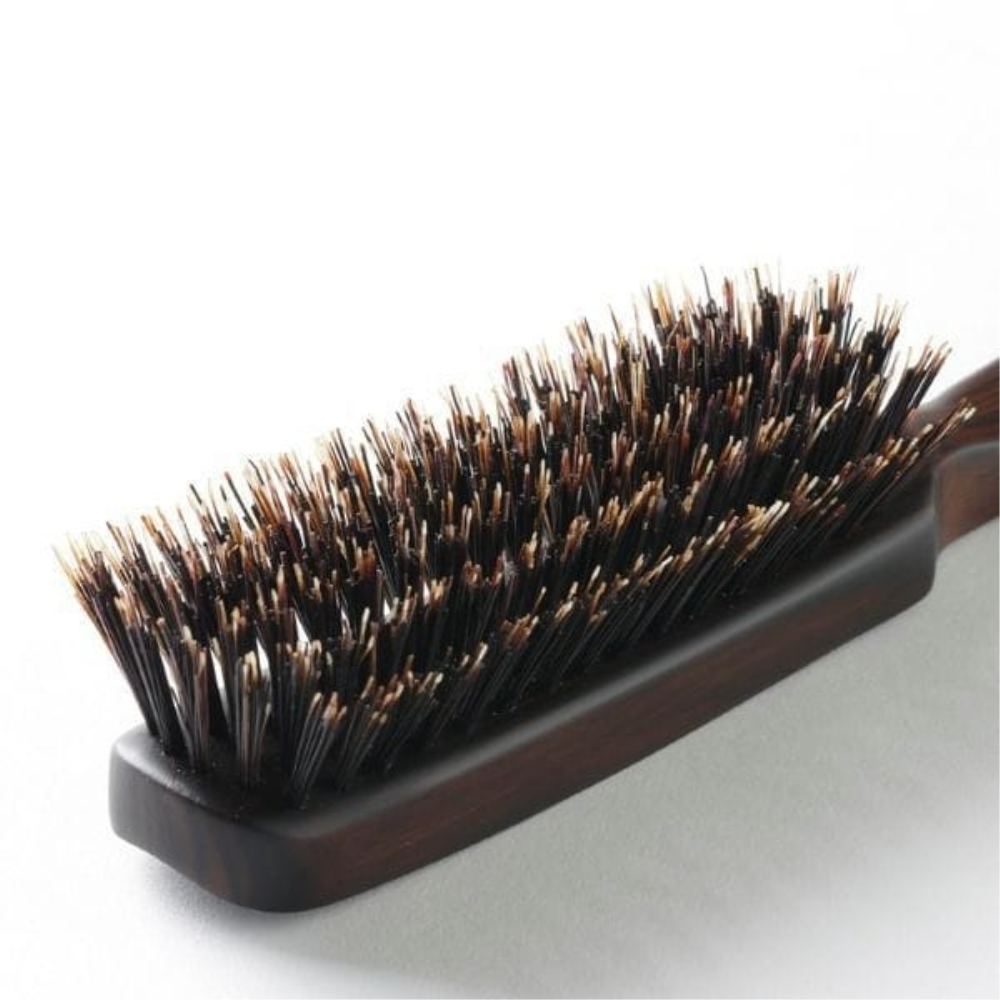 クオリティーの高い猪毛の毛根部分と中間の猪毛を調合、程よいコシがありしっかりと地肌まで届きブラッシングできます。毛の長さを不揃いにすることで的確に髪をとらえブラッシングの際に頭皮のマッサージ効果を求める方にお勧めです。普通の毛量の方にお勧めのブラシです。熟練の職人が手作りする希少価値のある国産ヘアブラシ!約100年に渡り培われてきた職人の感覚と技により、ひとつひとつ丹念に仕上げられた伝統を誇る逸品。手植えならではの巧の技術が活かされています。●お手入れ方法:ブラシ部分に髪の毛がたまりましたら、櫛などで取り除いてブラシクリーナーで隙間を掃除してください。天然毛ヘアブラシは水洗いしないことが原則です。直射日光やドライヤーで乾かすとヒビ割れの原因になってしまいます。毛穴に水分を残しますと、毛抜けなどの原因になるおそれがあります。木製のハンドル部分には黒檀を使用しています。末長くお使いになっていただくためにも、頻繁に洗うことはおやめください。