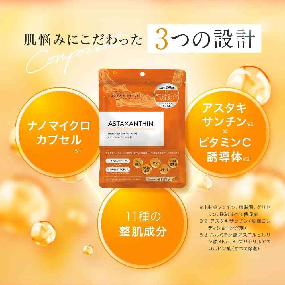(1)お肌に浸透しやすいナノマイクロカプセルに濃縮した、アスタキサンチンと2種類のビタミンC誘導体を配合。 (2)アスタキサンチンと2種のビタミンC誘導体が気になるハリ・弾力、うるおい不足、毛穴、ざらつき、くすみ・透明感にアプローチ。 (3)さらにコラーゲン、ヒアルロン酸、ナイアシンアミド、4種のセラミドなど11種の整肌成分がクリアな肌へ導きます。
