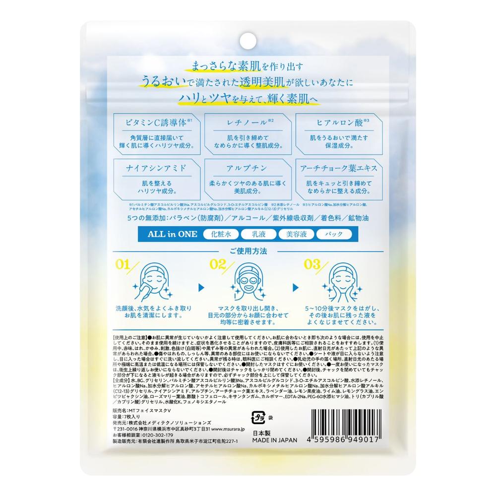 ・3種のビタミンC誘導体※1を配合し、毛穴※2ケアはもちろん、うるおい透明感※2のあるクリアな肌へ導く。 ・ターンオーバーに着目し、毛穴※2やシワ※3の目立たないうるおいたっぷり肌に整えるレチノールとナイアシンアミドを配合。 ・角質層まで潤いをとどけるヒアルロン酸が配合されたスペシャルケア用のフェイスマク。 ・潤いとハリを与えるアルブミン、肌をキュッと引き締めて整えるアーチチョーク葉エキスも配合。 ・防腐剤(パラベン)やエタノール、紫外線吸収剤、着色料、鉱物油は一切使用せず、「五つの無添加」を実現。 ・日本製シートを採用することでさらに安心感アップ。 ・化粧水、乳液、美容液、パックALLINONE時短ケアを実現。 ※1パルミチン酸アスコルビルリン酸3Na、アスコルビルグルコシド、3-0-エチルアスコルビン酸 ※2潤いによる ※3乾燥によるシワを目立たなくする
