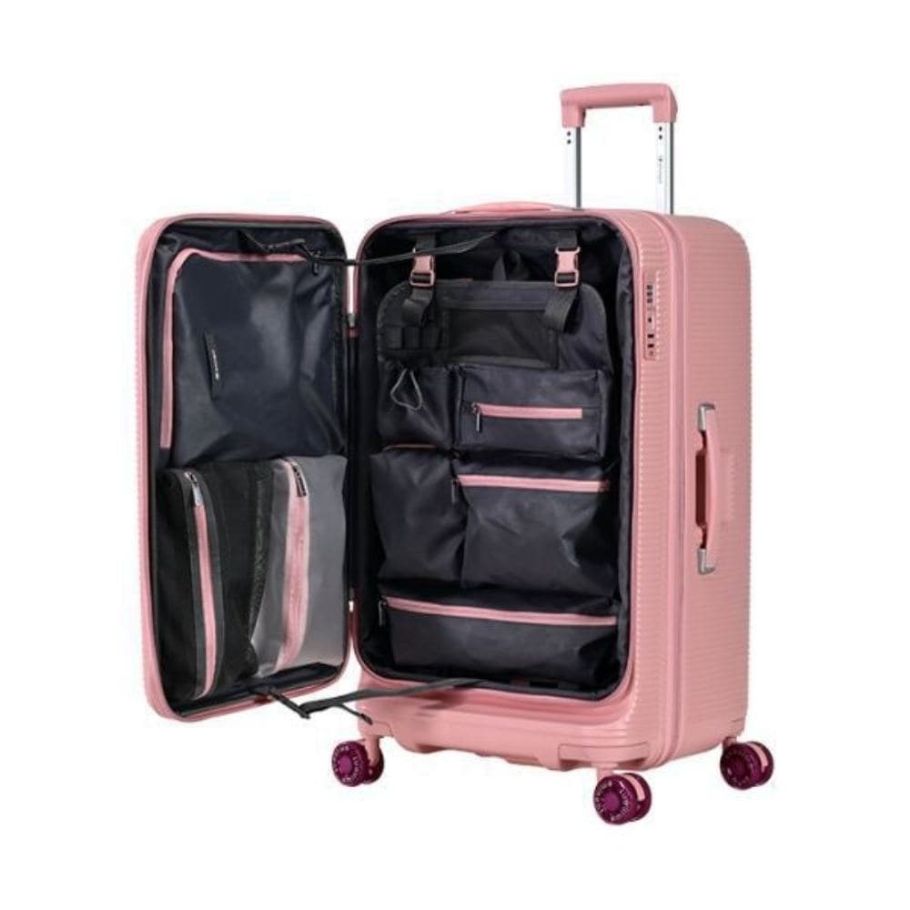 アウトドアを意識した拡張可能な多機能スーツケース。ショックアブソーバー付きキャスターを採用し移動もラクラク。取り外しできる収納で使い勝手も向上。TSAロック搭載で海外旅行も安心.TSAロック搭載で海外旅行も安心。収納比率1:9デザインにより、下部の収納スペースが深く、効率的に収納でき、空間を無駄にしません。防水収納袋と多層の収納スペースがあり、衣類、旅行用品、キャンプ用品を簡単に分類して収納できます。ショックアブソーバー付き360度回転キャスターで優れた衝撃吸収機能で引きやすさと静音性が向上。仕切り板は取り外し可能で、臨時の収納バスケットとしても使えます。最上部の2つの収納ポーチは取り外して持ち運びでき、使用の自由度が大幅にアップ。横向きに置くと、小さなテーブルに早変わり。飲み物や小物を軽く置けるようになり、テント設営や装備整理の合間にも便利です。正面には2つの円形のくぼみがあり、飲み物を置いても倒れる心配なし。背面には折りたたみ式カップホルダーがあり、飲み物や傘などを置けます。側面フック付きの足元収納で、提げバッグなどを掛けることができます。