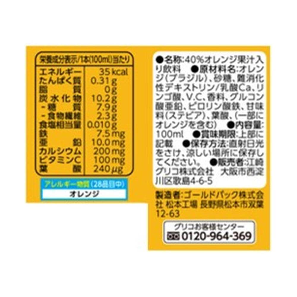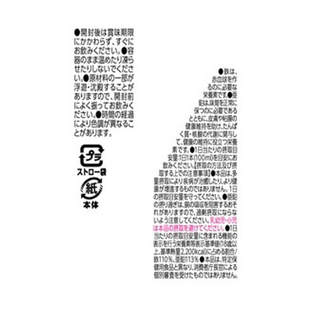 【栄養成分1本(100ml)当たり】エネルギー:35kcal たんぱく質:0.31g 脂質:0g 炭水化物:10.2g ‐糖質7.9g ‐食物繊維:2.3g 食塩相当量:0.01g 鉄:7.5mg 亜鉛:10.0mg カルシウム:200mg ビタミンC:100mg 葉酸:240μg 【原材料名】オレンジ(ブラジル)、砂糖、難消化性デキストリン/乳酸Ca、リンゴ酸、V.C、香料、グルコン酸亜鉛、ピロリン酸鉄、甘味料(ステビア)、葉酸(一部にオレンジを含む)