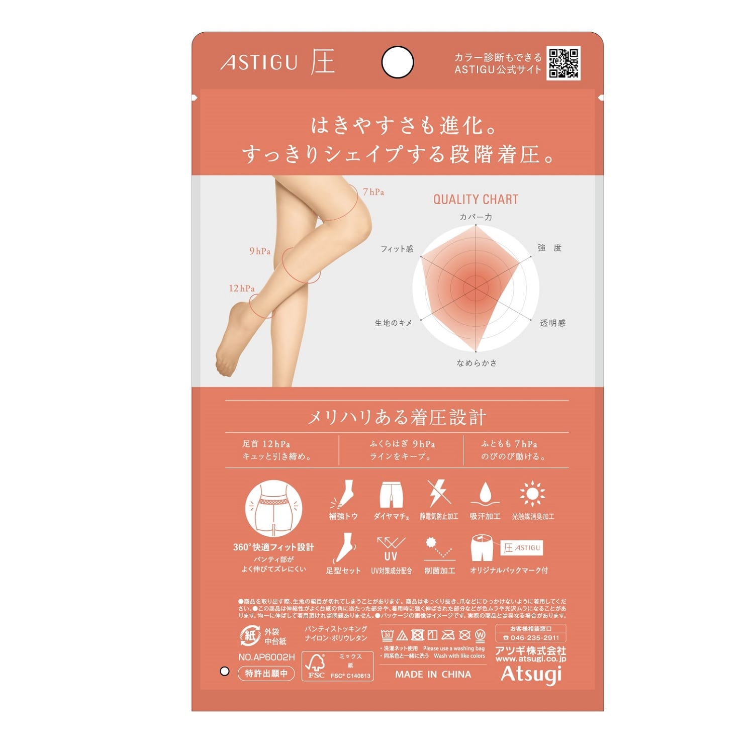 はきやすさも進化。すっきりシェイプする段階着圧。パンティ部がよく伸びてズレにくい。補強トウ。ダイヤマチ。静電気防止加工。吸汗加工。光触媒消臭加工。UV対策成分配合。足型セット。制菌加工。オリジナルバックマーク付