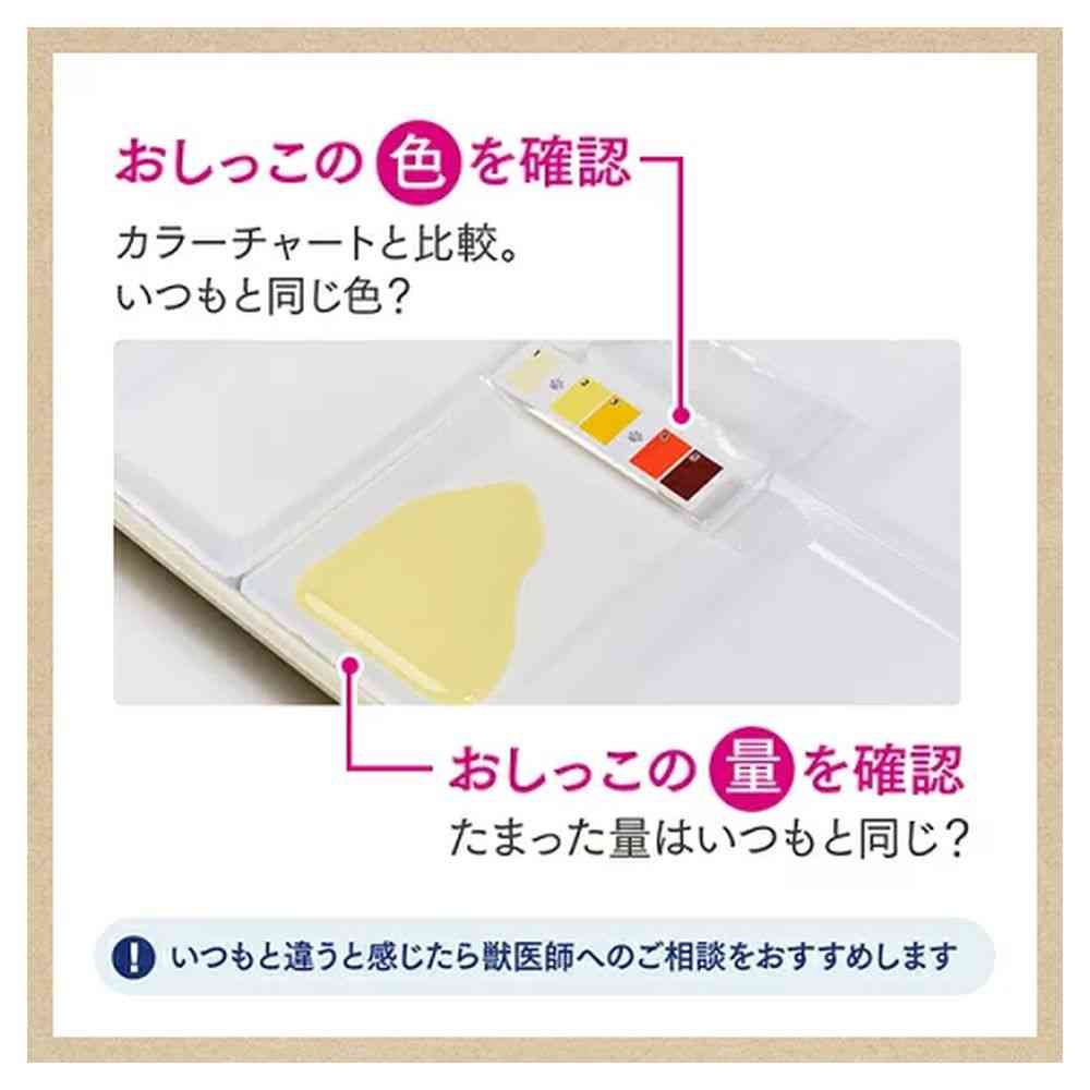 本品は猫の尿比重を簡易的にチェックするものです。猫の疾患や症状を診断、治療するものではありません。 おしっこ比重チェッカーは1回使い切りです。1度使用した物を再使用しないでください。 おしっこの濃さ(比重)は、猫ちゃんの食餌、時間帯、使用時の環境などで変化する場合があります。