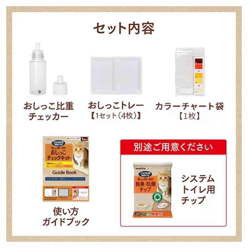 ・おしっこ比重チェッカー:材質:PE(本体、中栓)、PP(スクリューキャップ)、ABS(比重ビーズ) ・おしっこトレー:素材:PET ・カラーチャート袋:素材:PE(袋)、コート紙(シール)