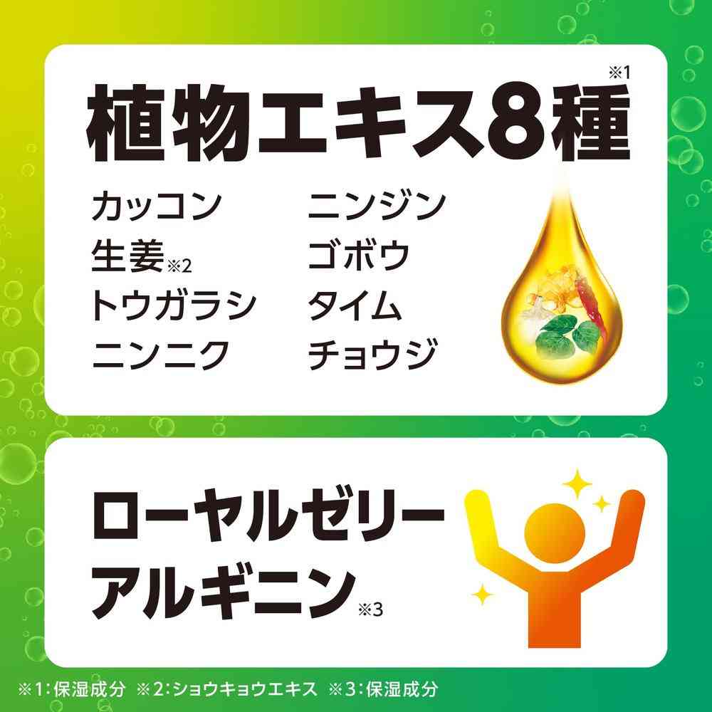 【有効成分】炭酸水素Na、炭酸Na、乾燥硫酸Na 【その他の成分】フマル酸、コハク酸、デキストリン、PEG6000、カッコンエキス、ショウキョウエキス(生姜エキス)、トウガラシエキス、ニンニクエキス、人参エキス、ゴボウエキス、タイムエキス-2、チョウジエキス、ローヤルゼリーエキス、アルギニン、PVP、軽質無水ケイ酸、無水ケイ酸、ステアリン酸Mg、ステアリン酸PEG、POE(300)POP(55)、石けん用素地、流動パラフィン、BG、パラベン、塩化トリメチルアンモニオヒドロキシプロピルヒドロキシエチルセルロース、塩化Na、エタノール、香料、青1、黄4、黄5、黄202(1)